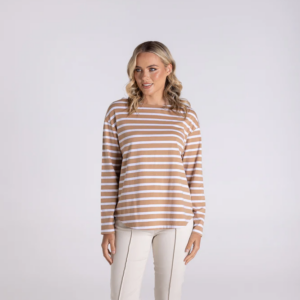Two-T’s – Stripe Boat Neck 7/8 Sleeve – Sand/ White