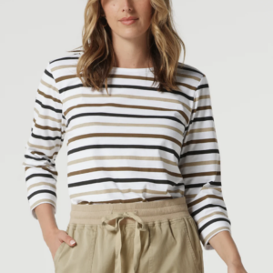 Goondiwindi Cotton – 3/4 Sleeve Cotton Stripe Tee – White/ Sage