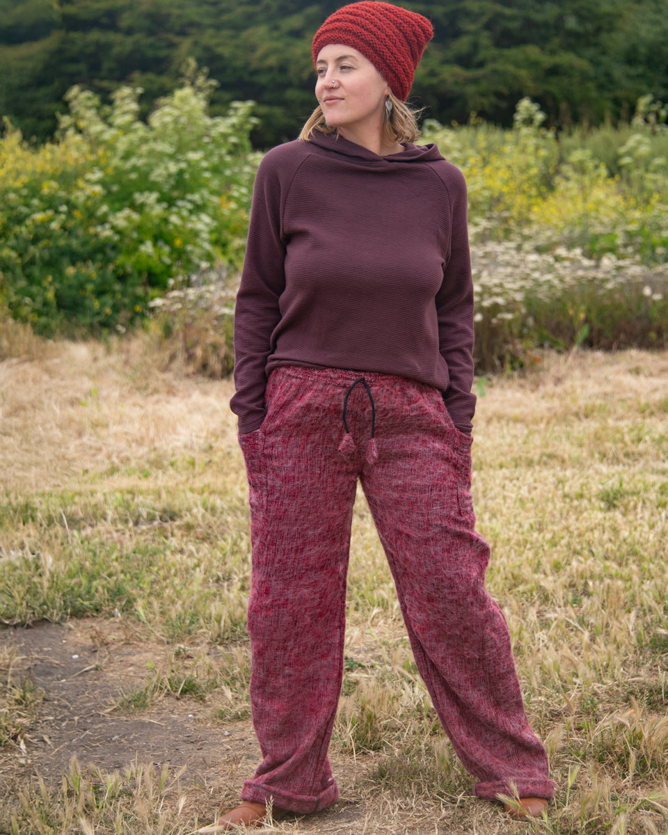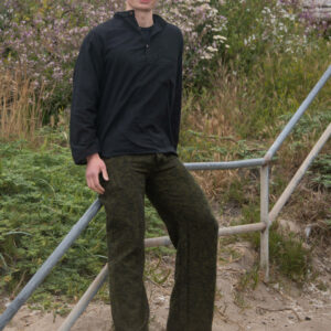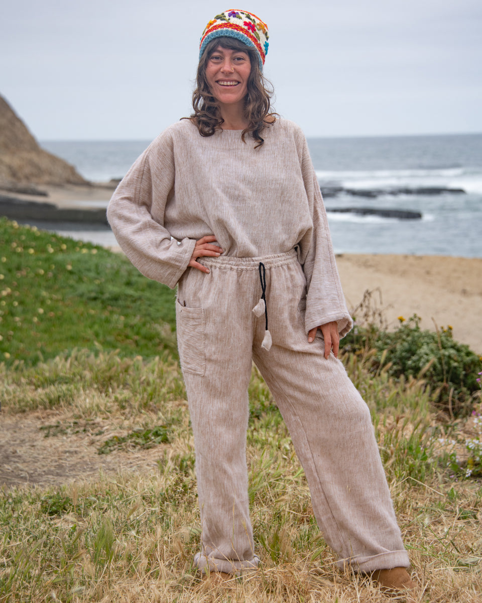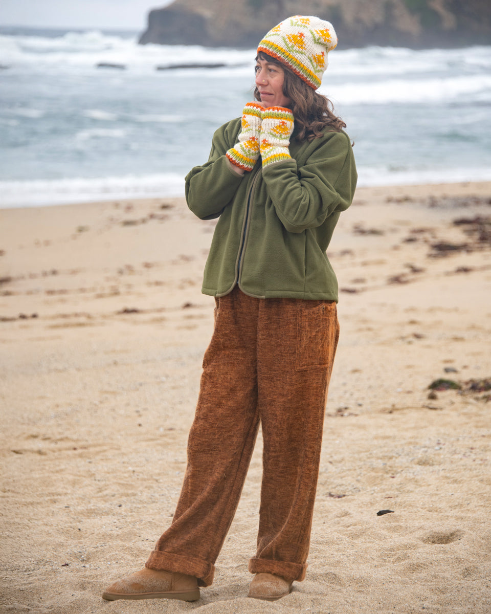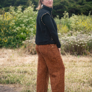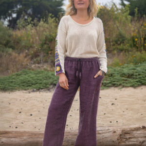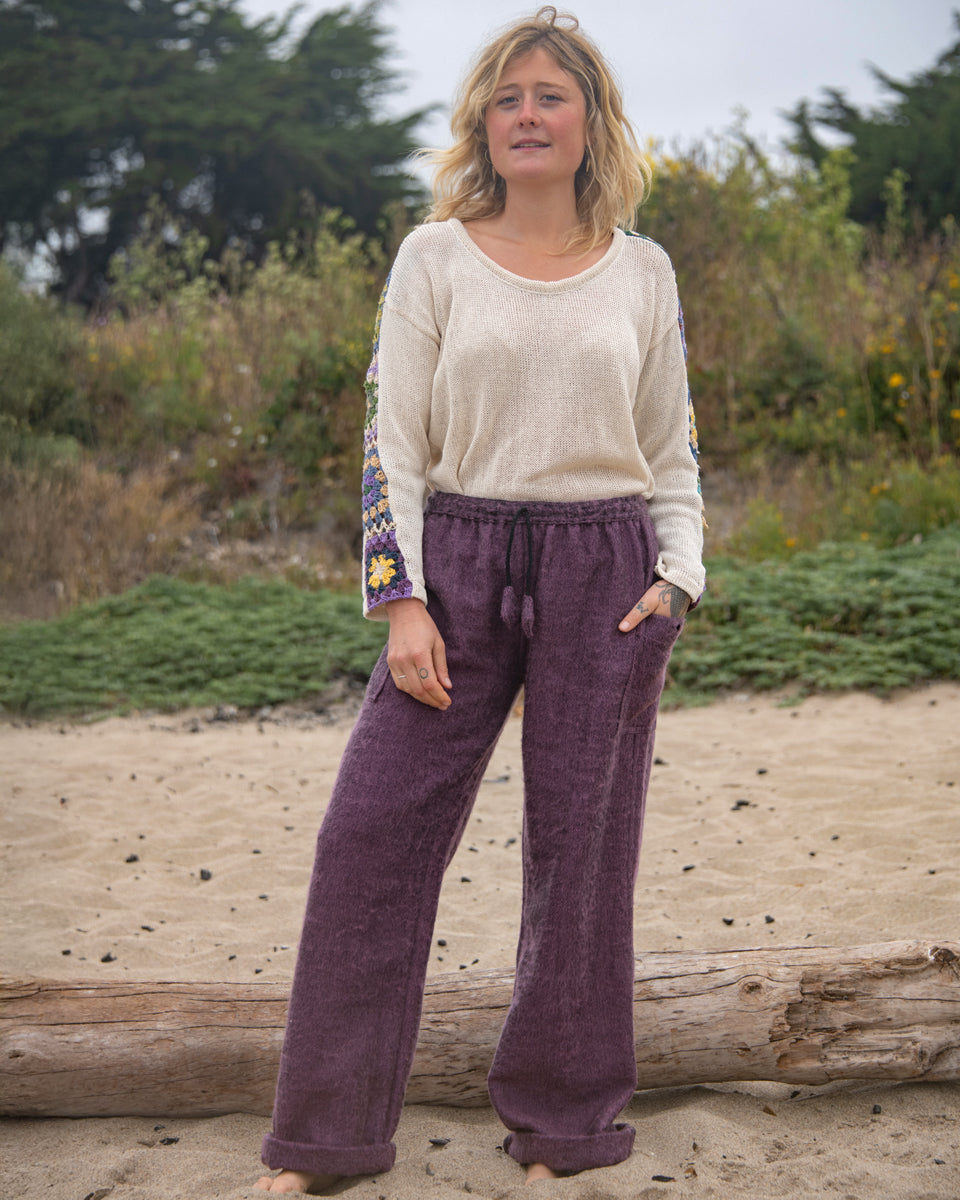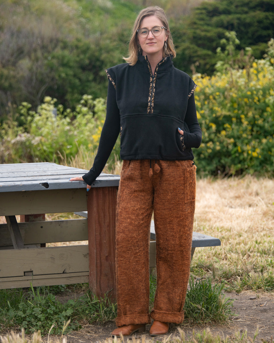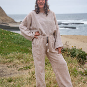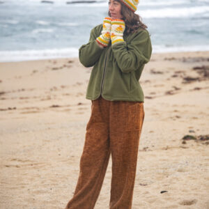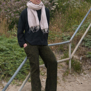 These pants are made out of our famous “Brushed Woven” material, the weft is 100% acrylic woven on a cotton warp. After the weaving process the material is brushed to bring out its incredible softness and can be refreshed with re-brushing after wear.