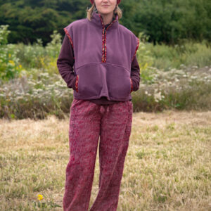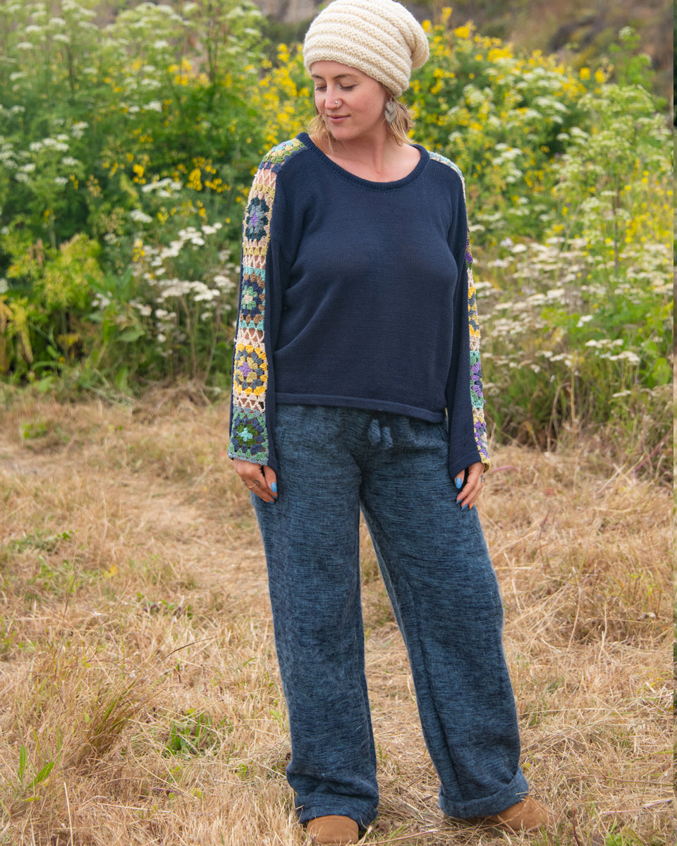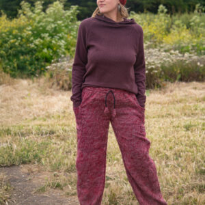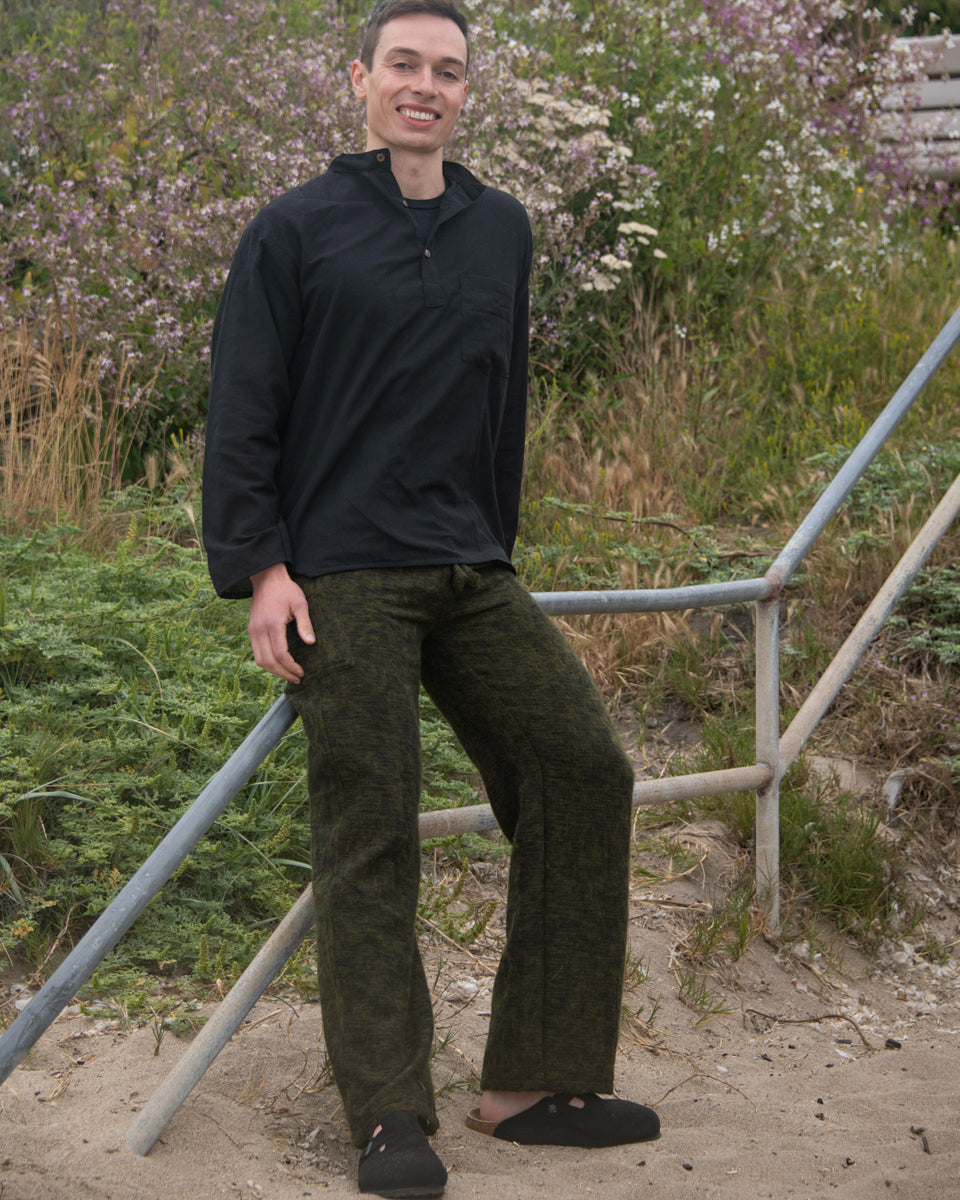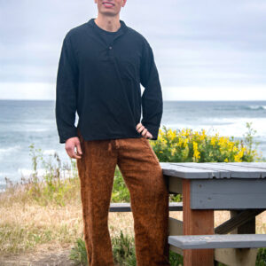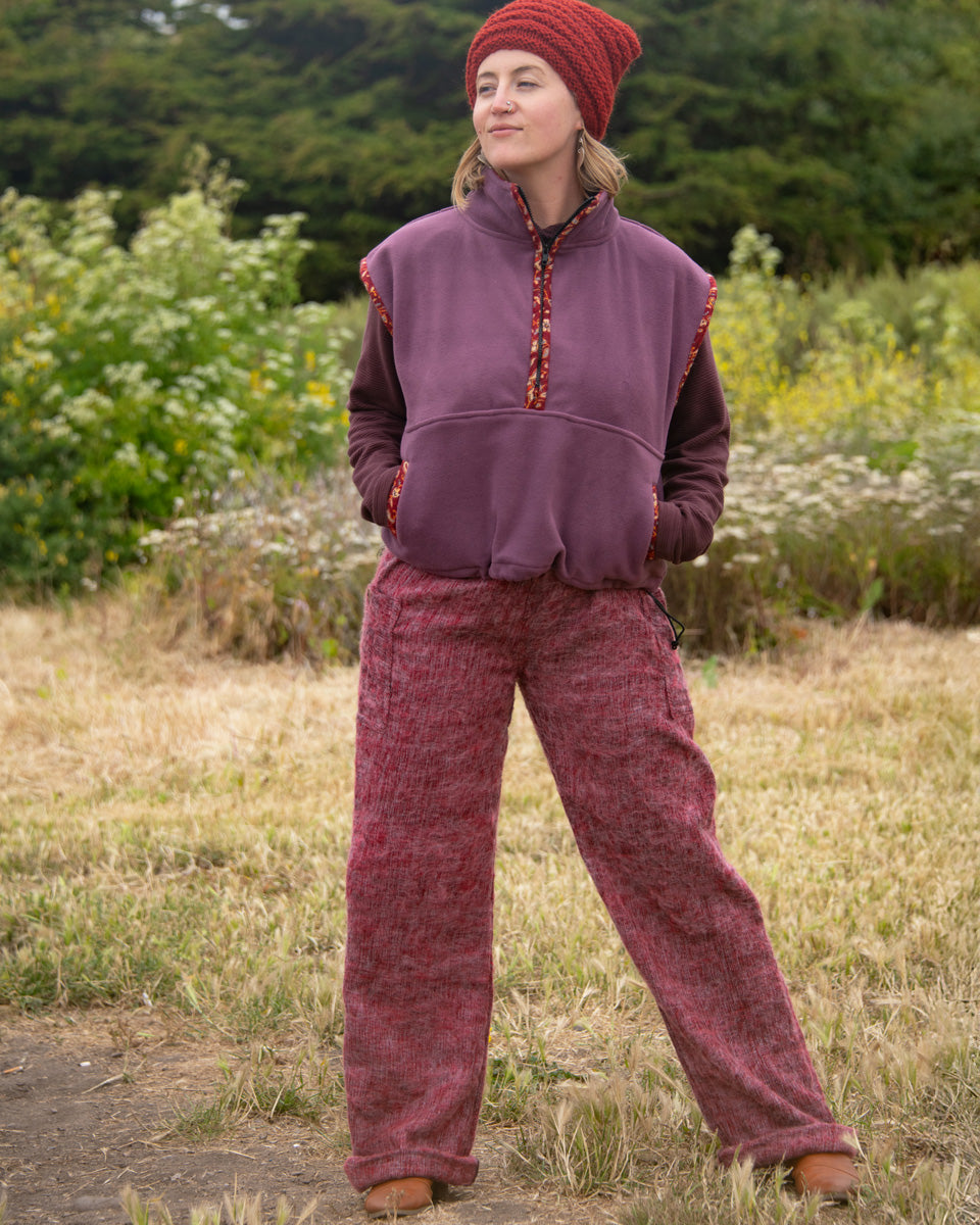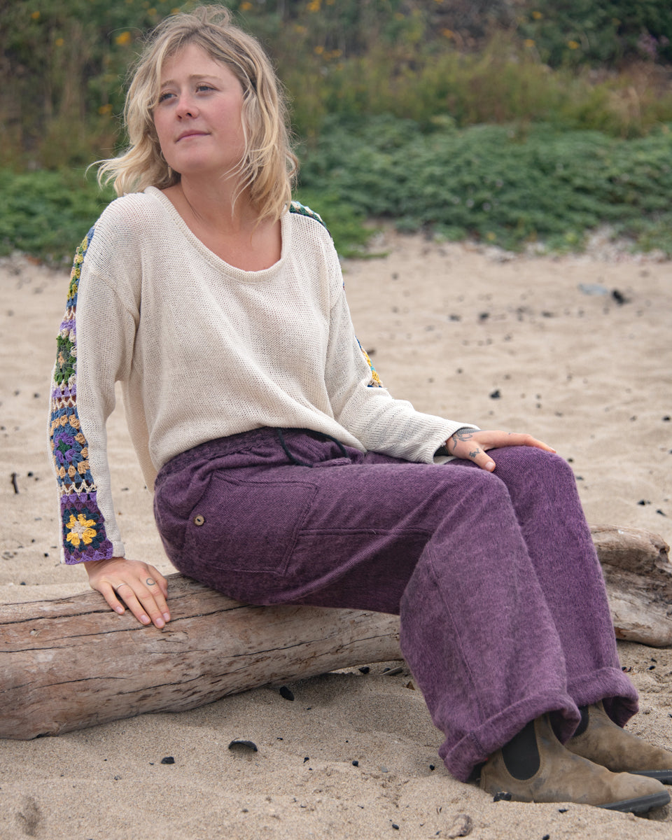 These pants are made out of our famous “Brushed Woven” material, the weft is 100% acrylic woven on a cotton warp. After the weaving process the material is brushed to bring out its incredible softness and can be refreshed with re-brushing after wear.