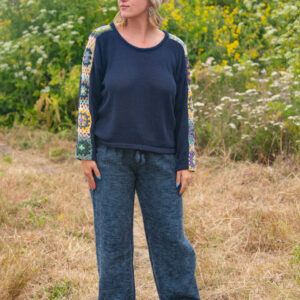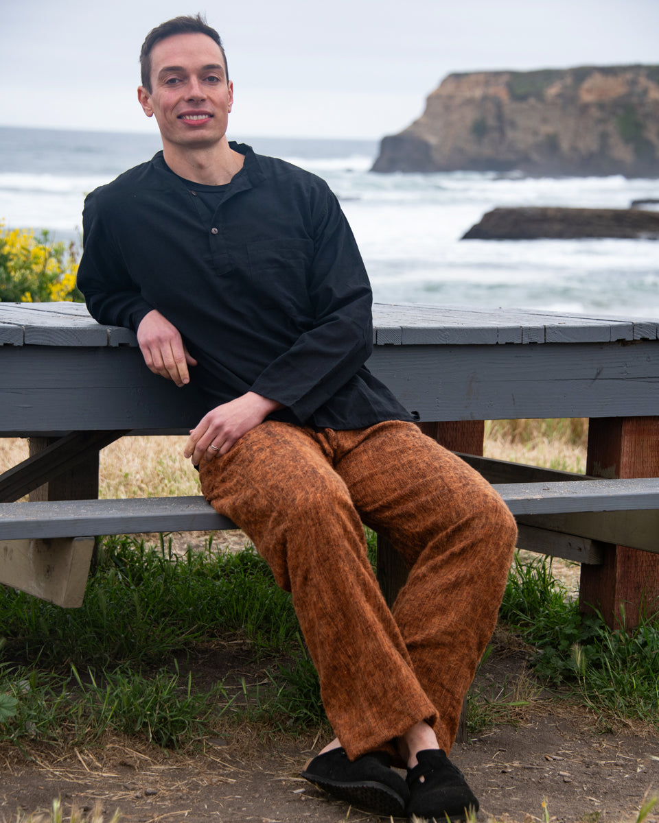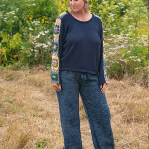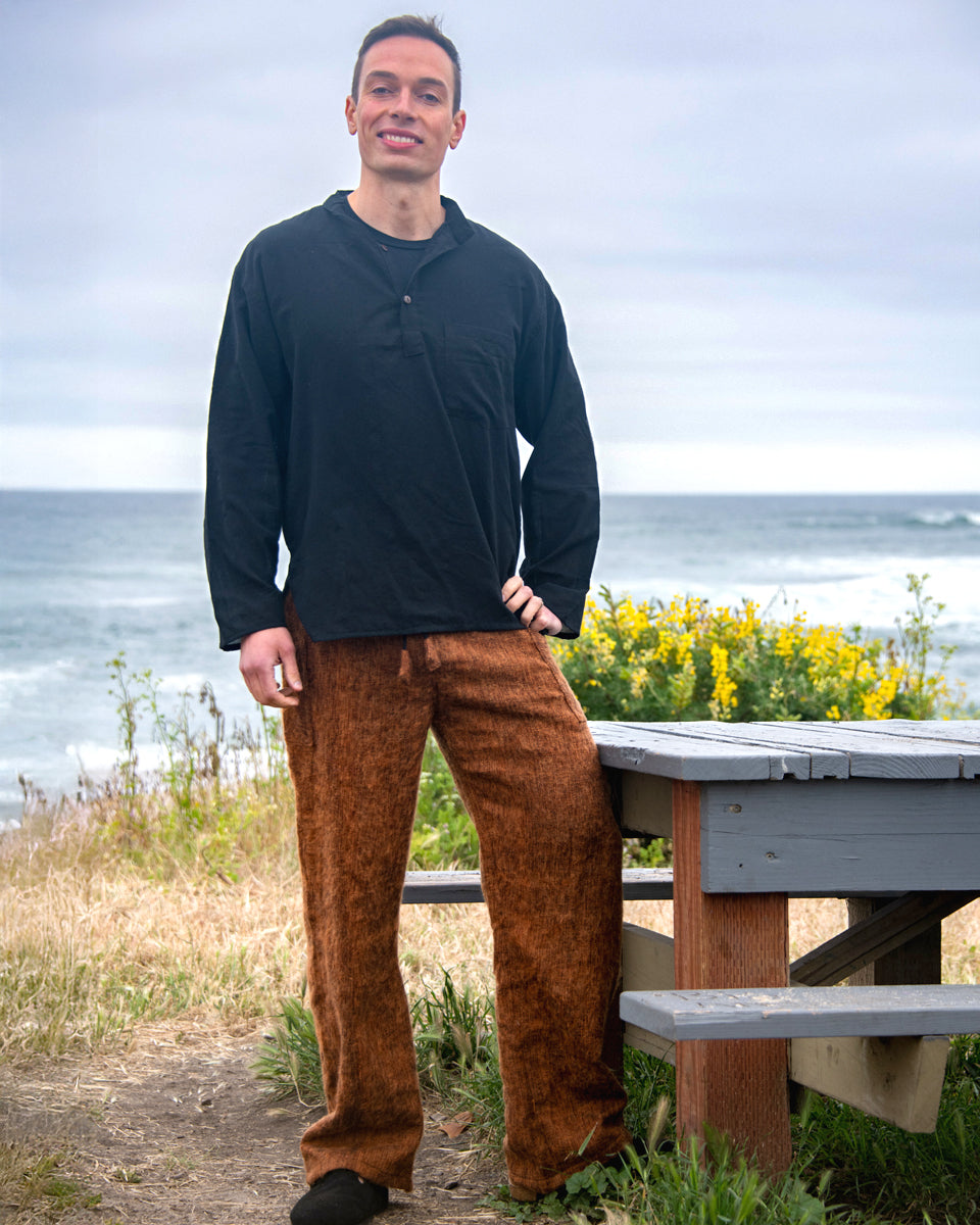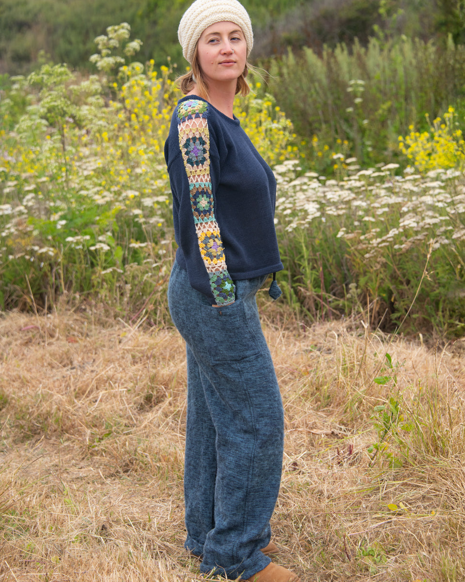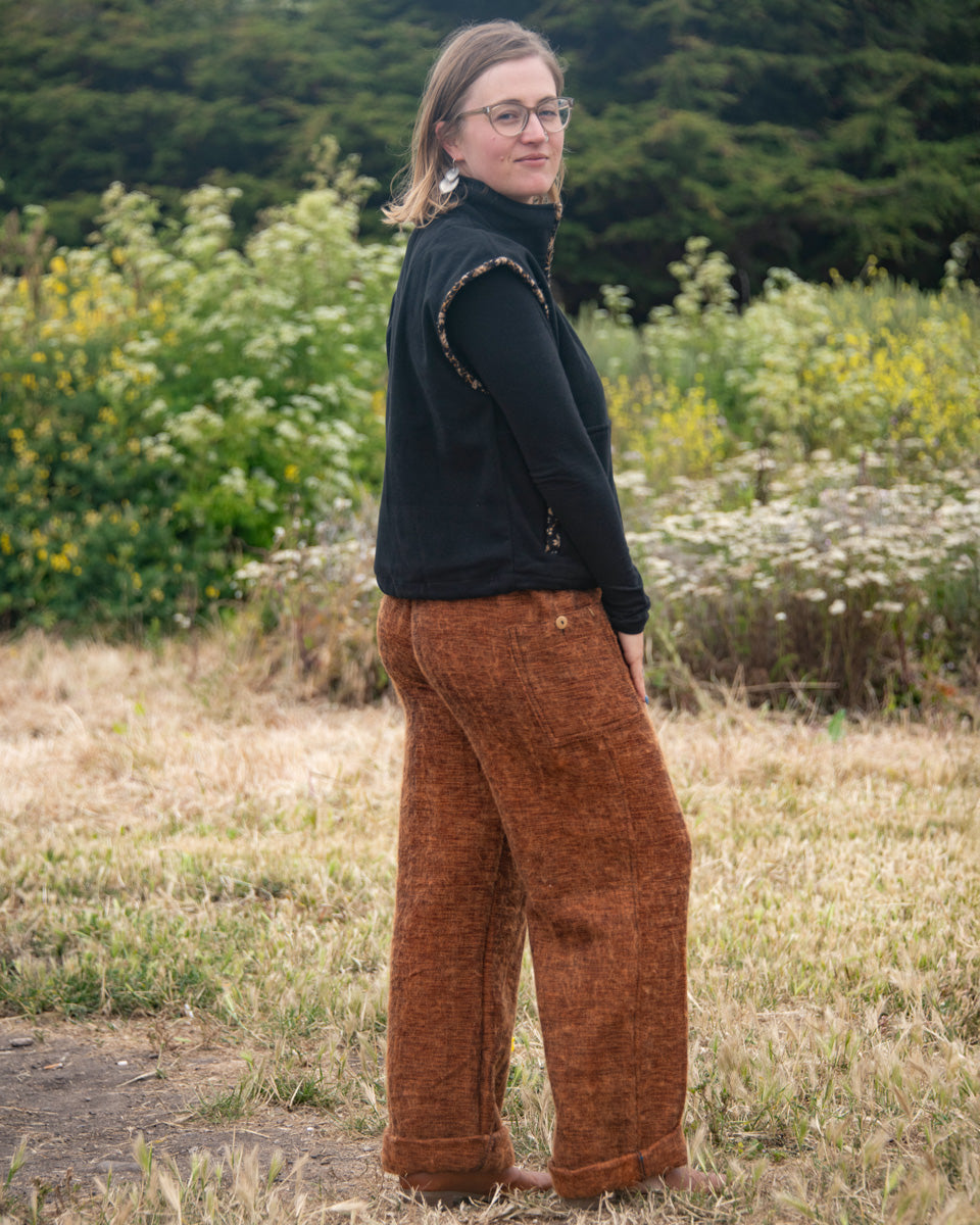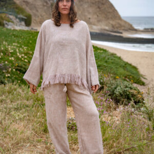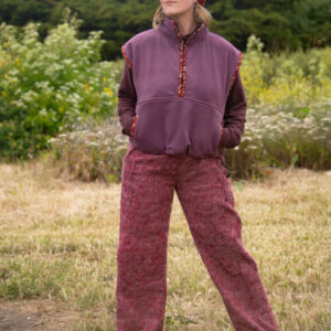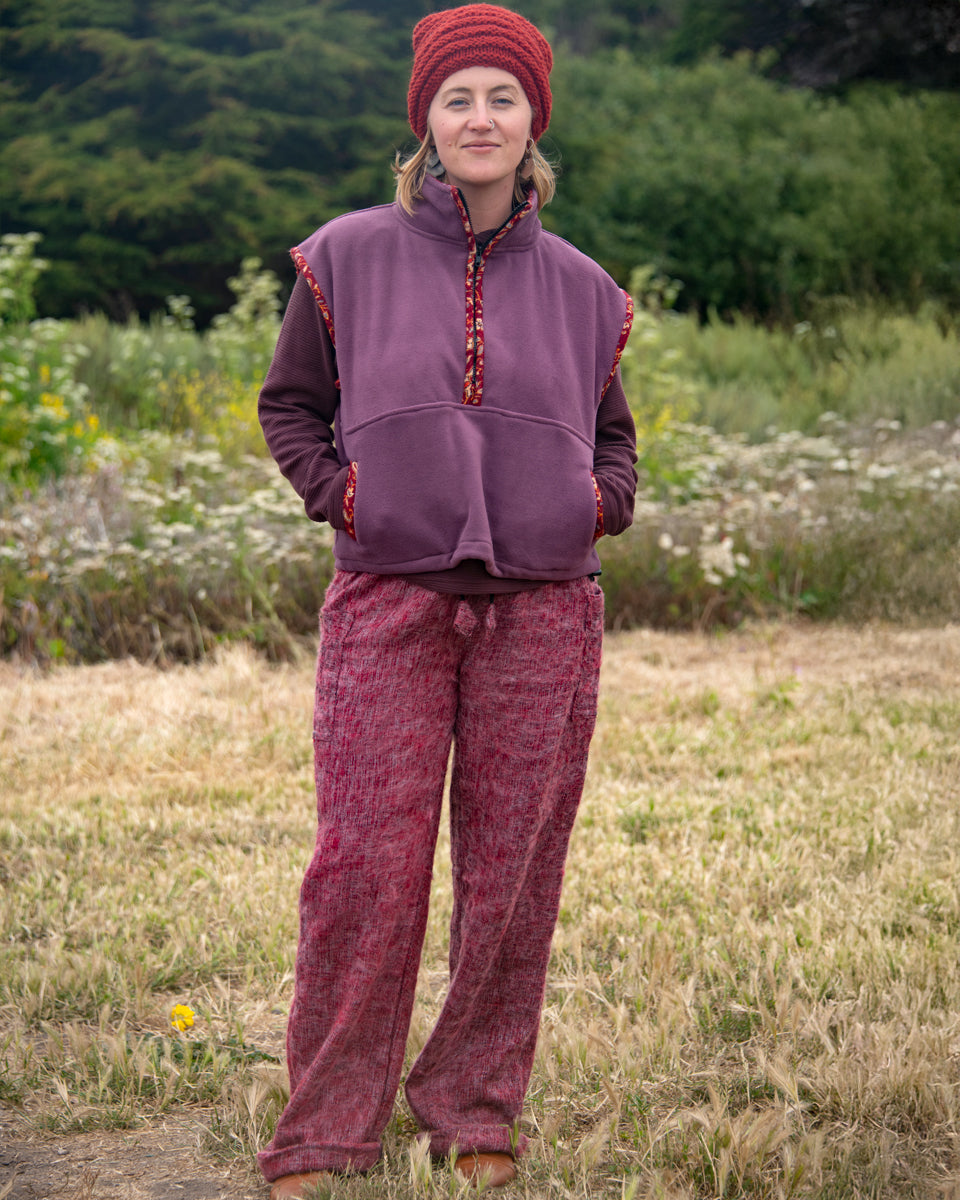 These pants are made out of our famous “Brushed Woven” material, the weft is 100% acrylic woven on a cotton warp. After the weaving process the material is brushed to bring out its incredible softness and can be refreshed with re-brushing after wear.