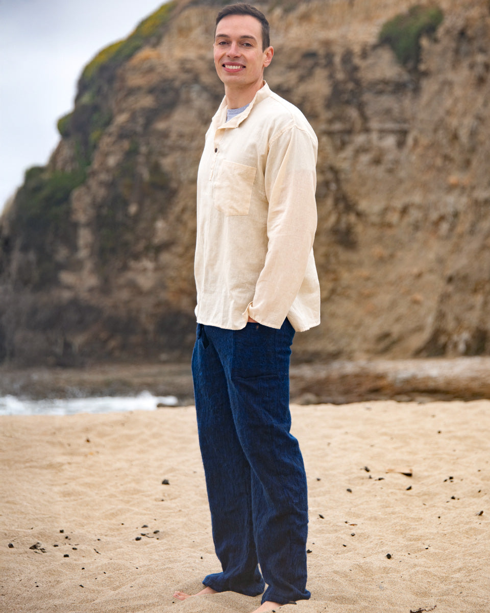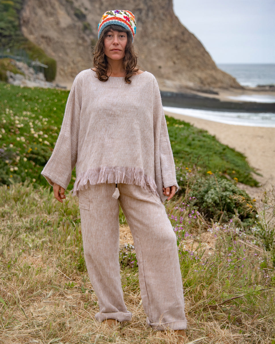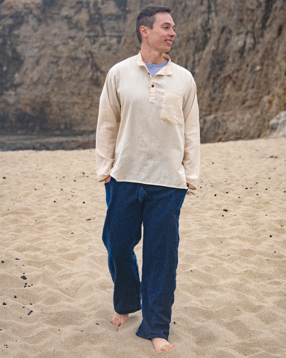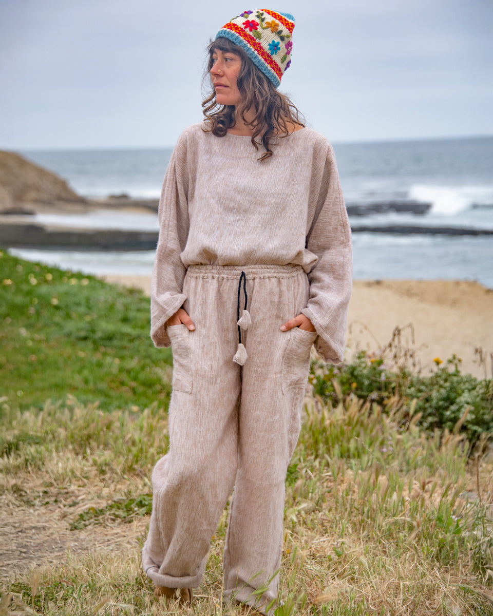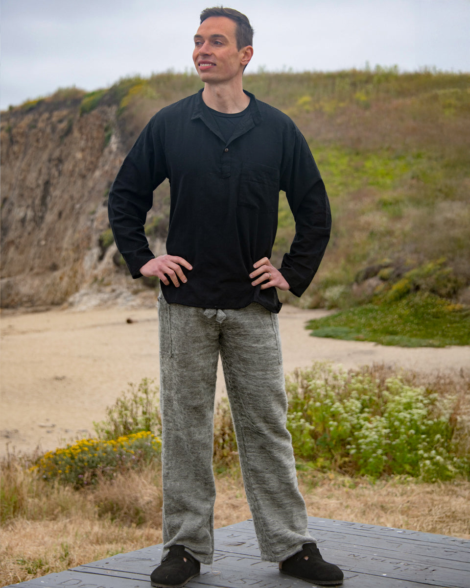 These pants are made out of our famous “Brushed Woven” material, the weft is 100% acrylic woven on a cotton warp. After the weaving process the material is brushed to bring out its incredible softness and can be refreshed with re-brushing after wear.
