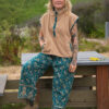 These comfortable pants feature two front pockets with button closures, plus a drawstring and elastic waistband for a perfect fit