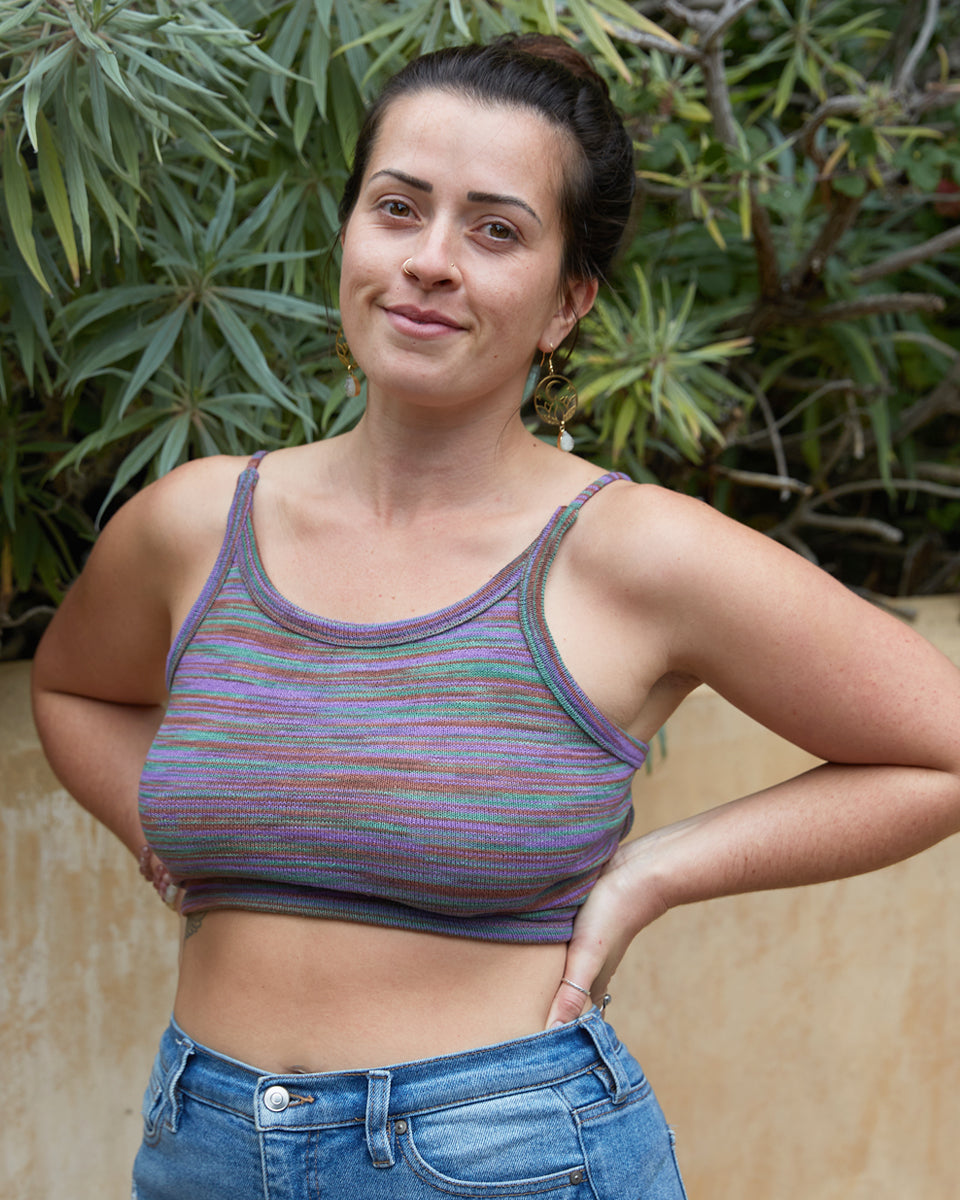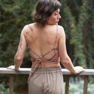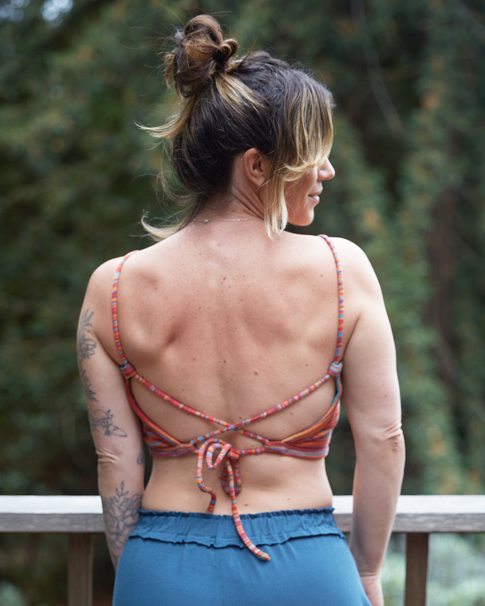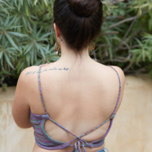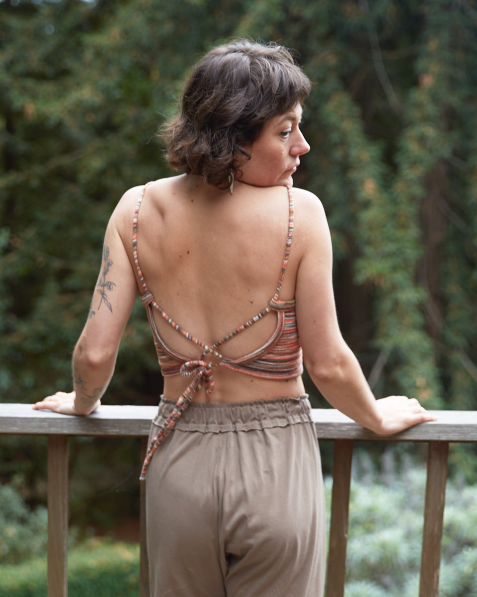 This back-tie top is made out of a multi stripe, cotton knit. It features an open back with adjustable straps.