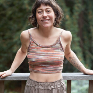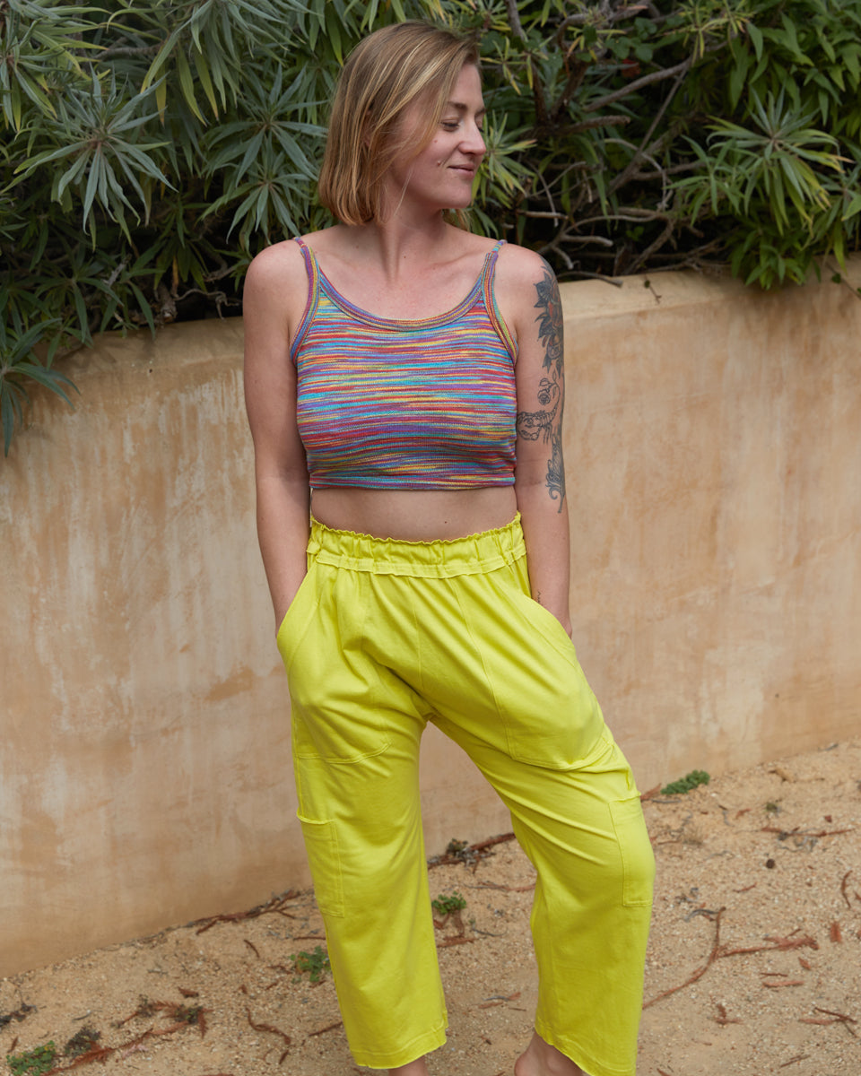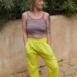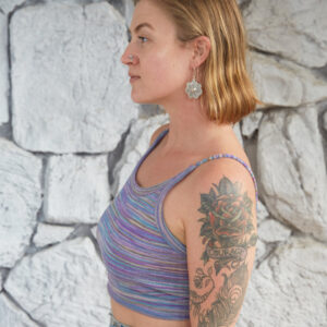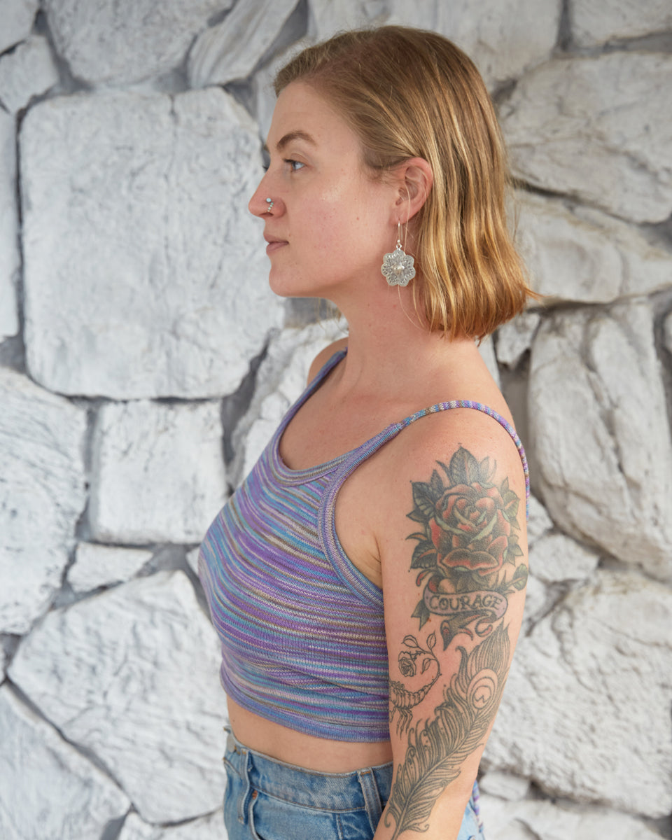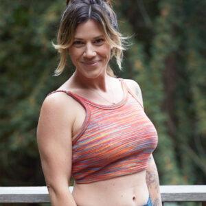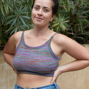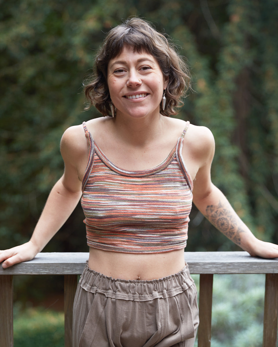 This back-tie top is made out of a multi stripe, cotton knit. It features an open back with adjustable straps.