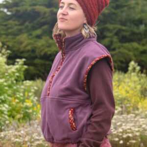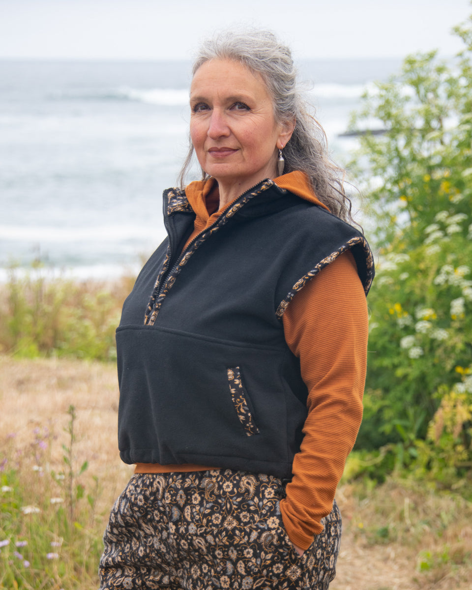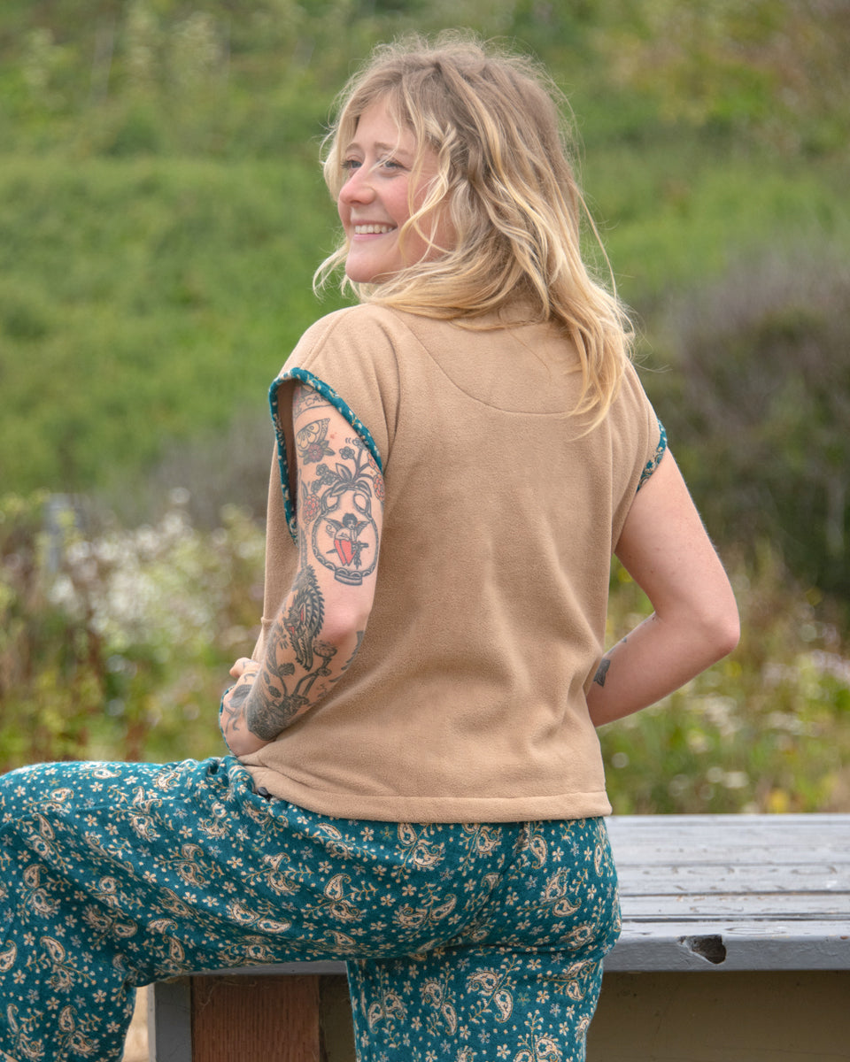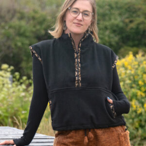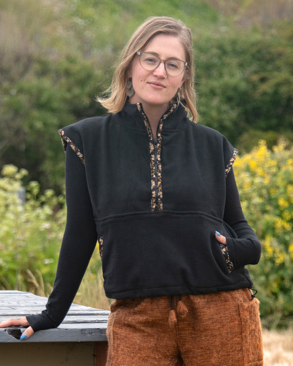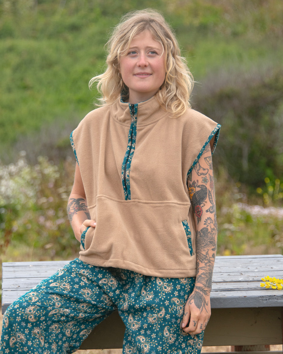 This cozy fleece vest features a half-zip front, side pockets, and paisley piping. It is made out of a polyester fleece and is slightly cropped.