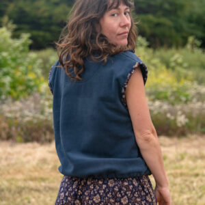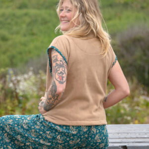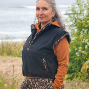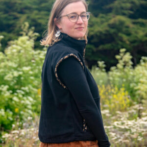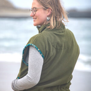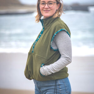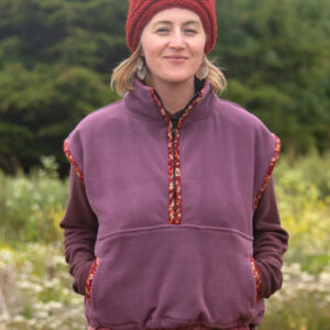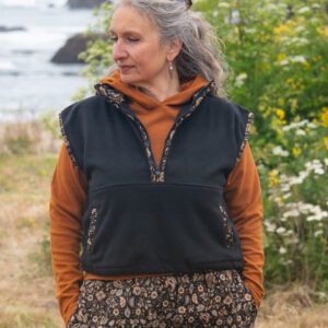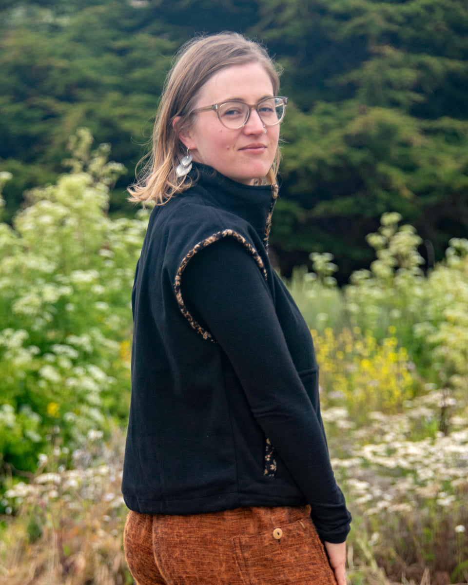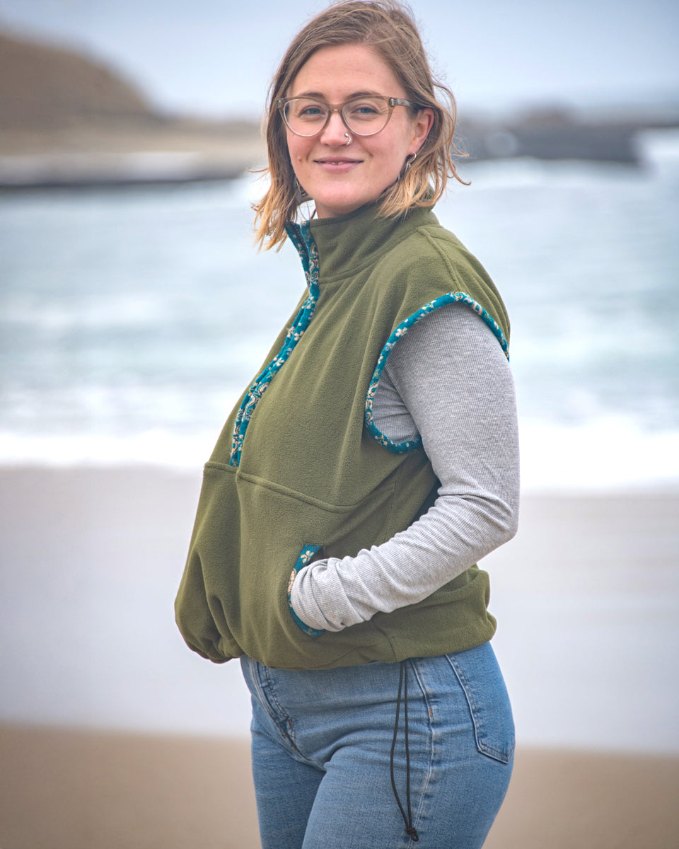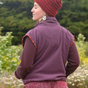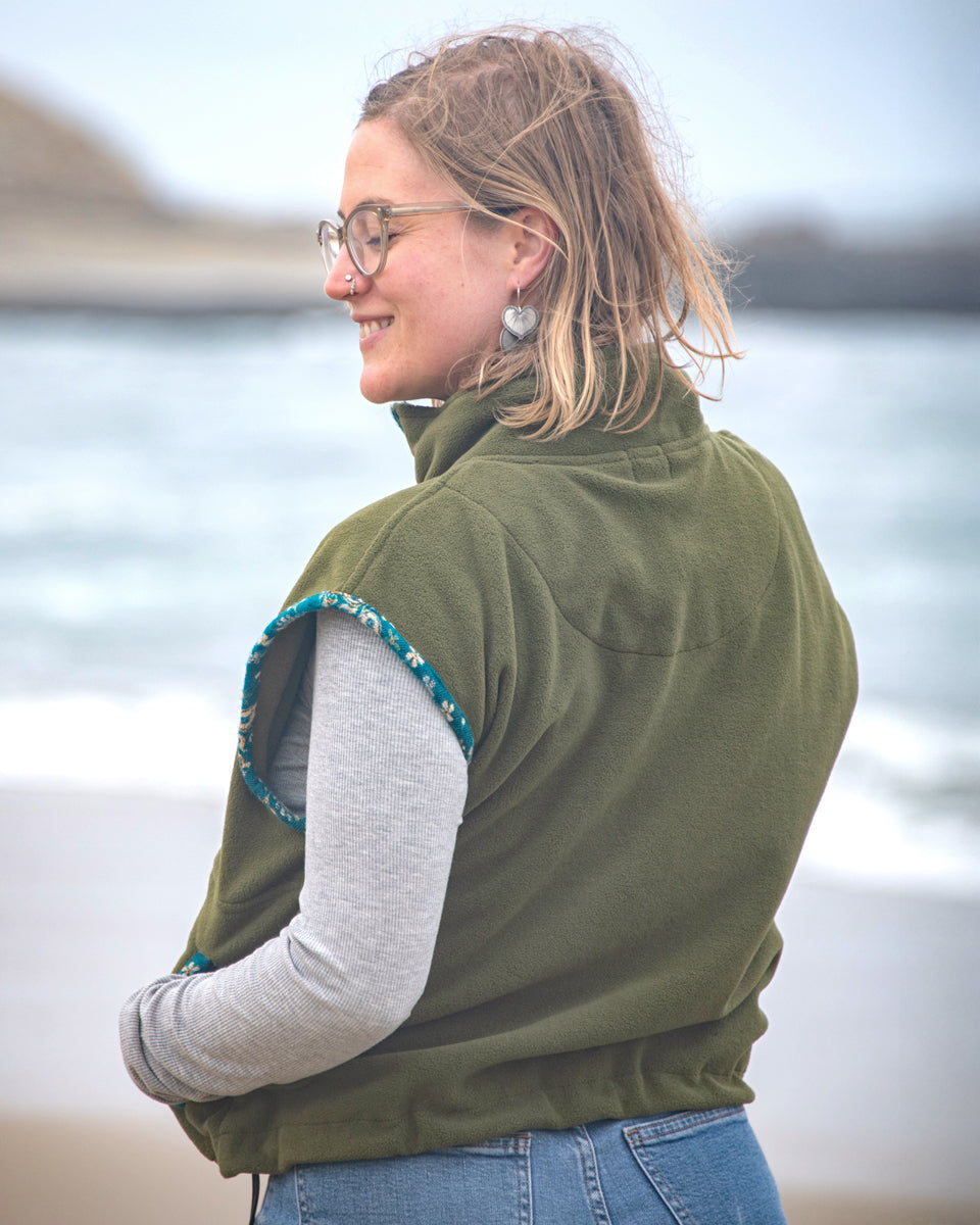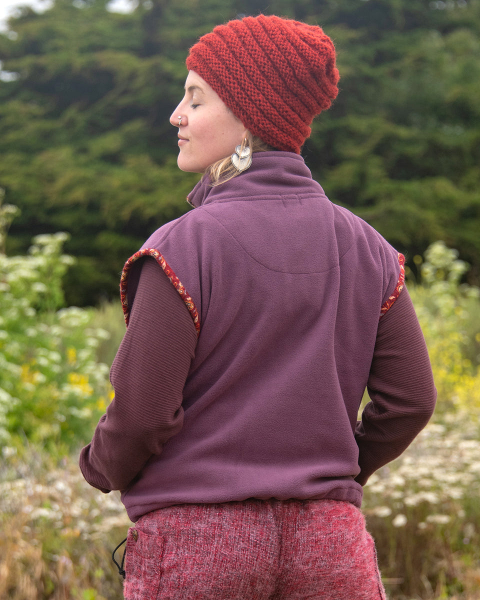 This cozy fleece vest features a half-zip front, side pockets, and paisley piping. It is made out of a polyester fleece and is slightly cropped.