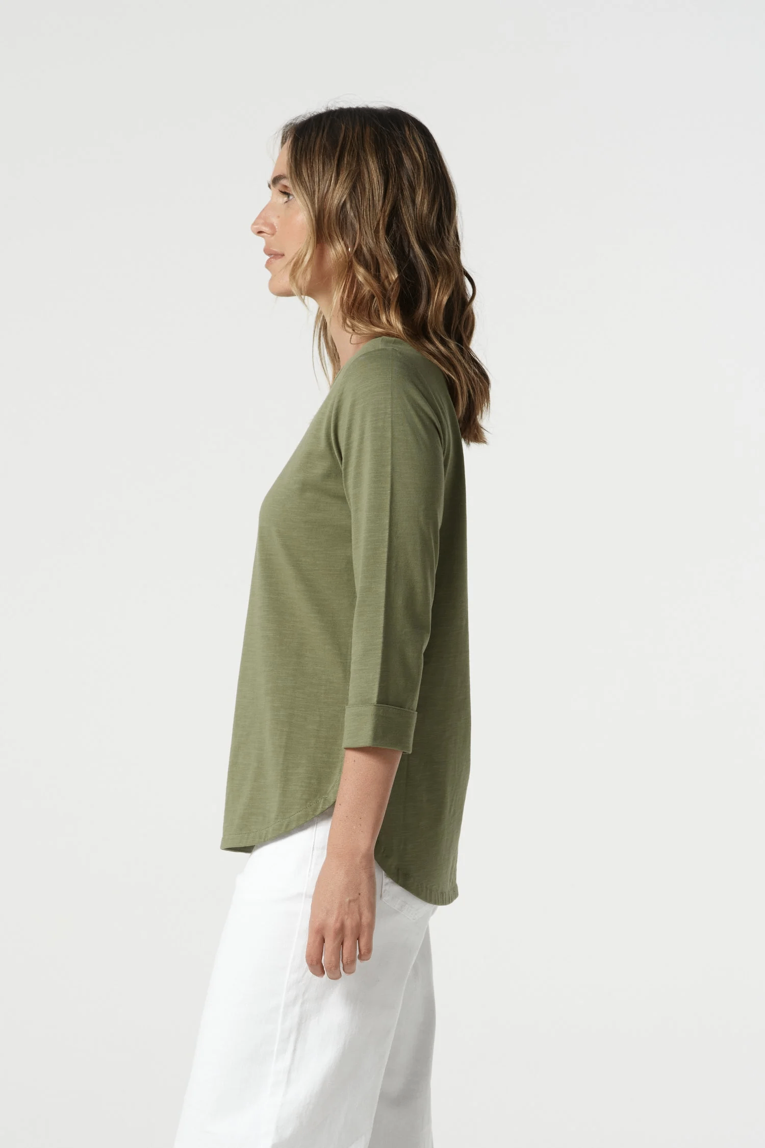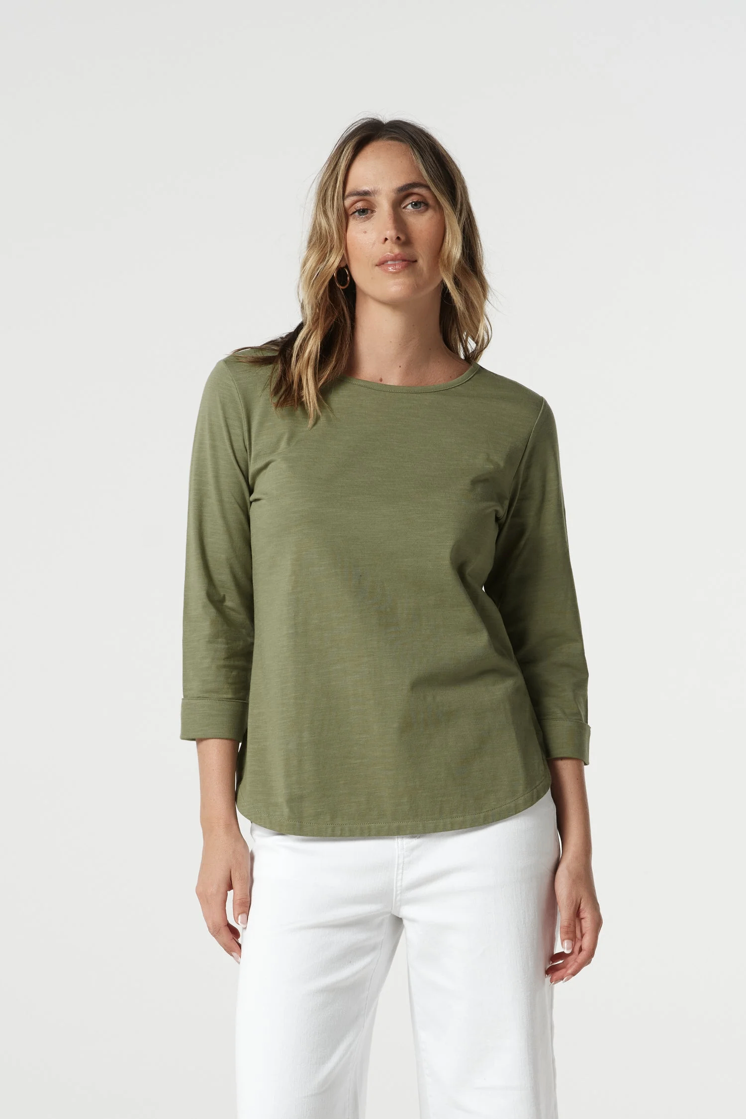 The Goondiwindi Cotton Pima Cotton Crew Neck 3/4 Sleeve Tee in Sage Green is a timeless everyday essential crafted from 100% cotton slub for a soft, breathable feel. It features a classic crew neckline and flattering 3/4 sleeves, designed in a comfortable regular fit with gentle shaping through the waist. The curved hemline, slightly longer at the back, adds a modern finish, while the feature stitching on the faced hemline gives it a refined touch. A versatile piece you’ll reach for season after season.