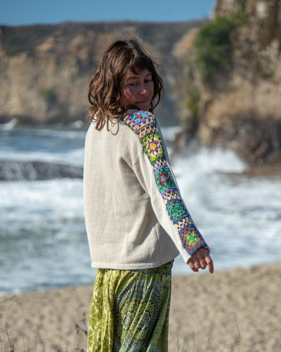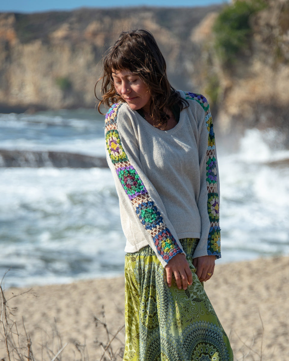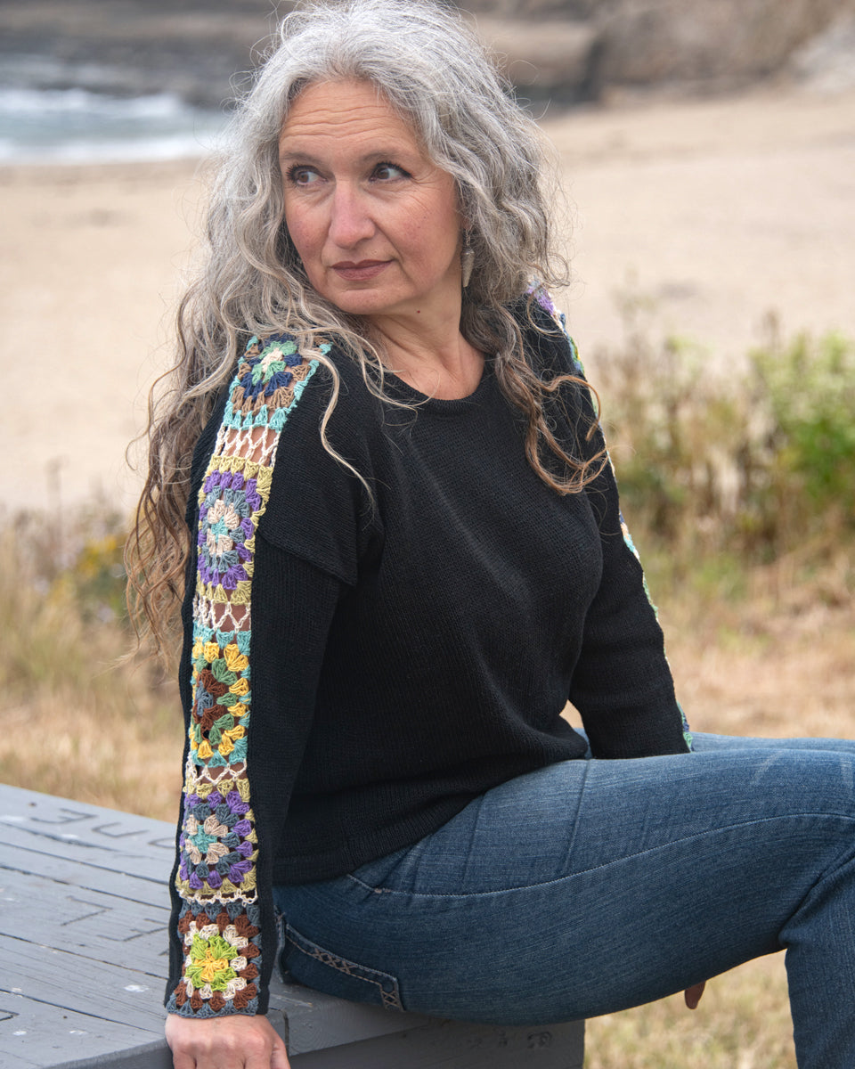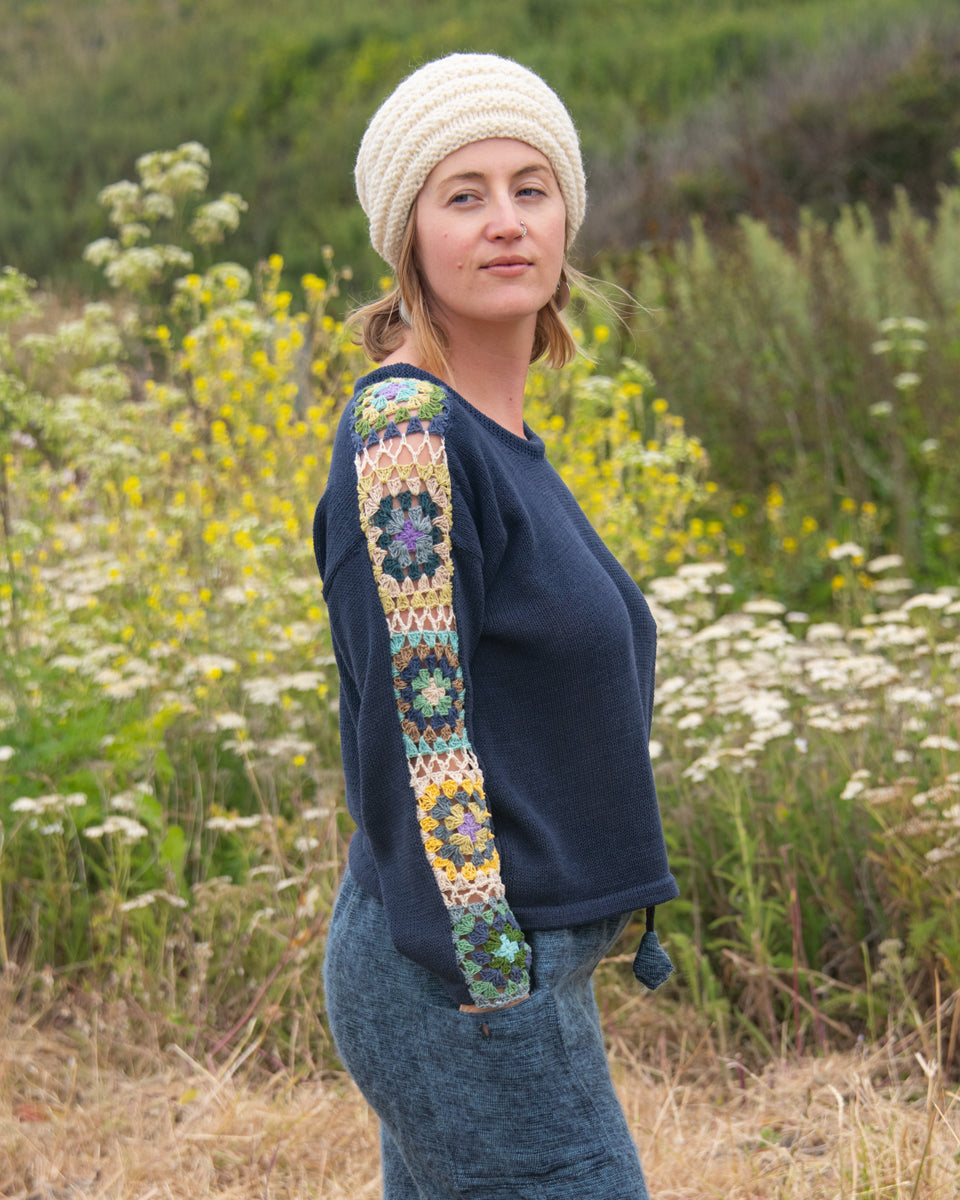 This long sleeve cotton sweater features granny squares on the sleeves