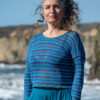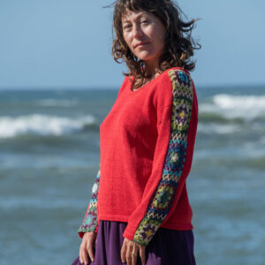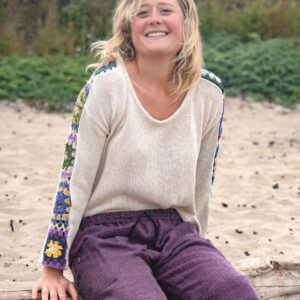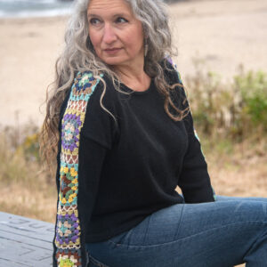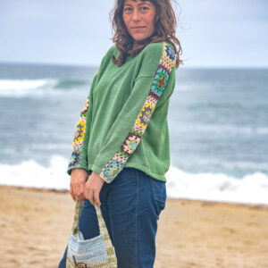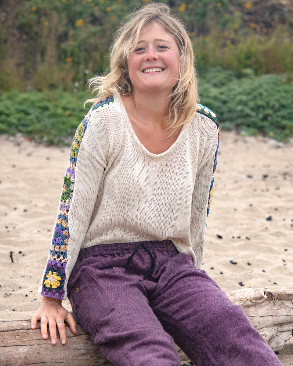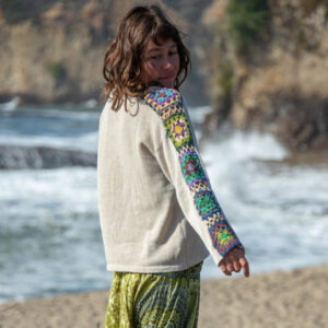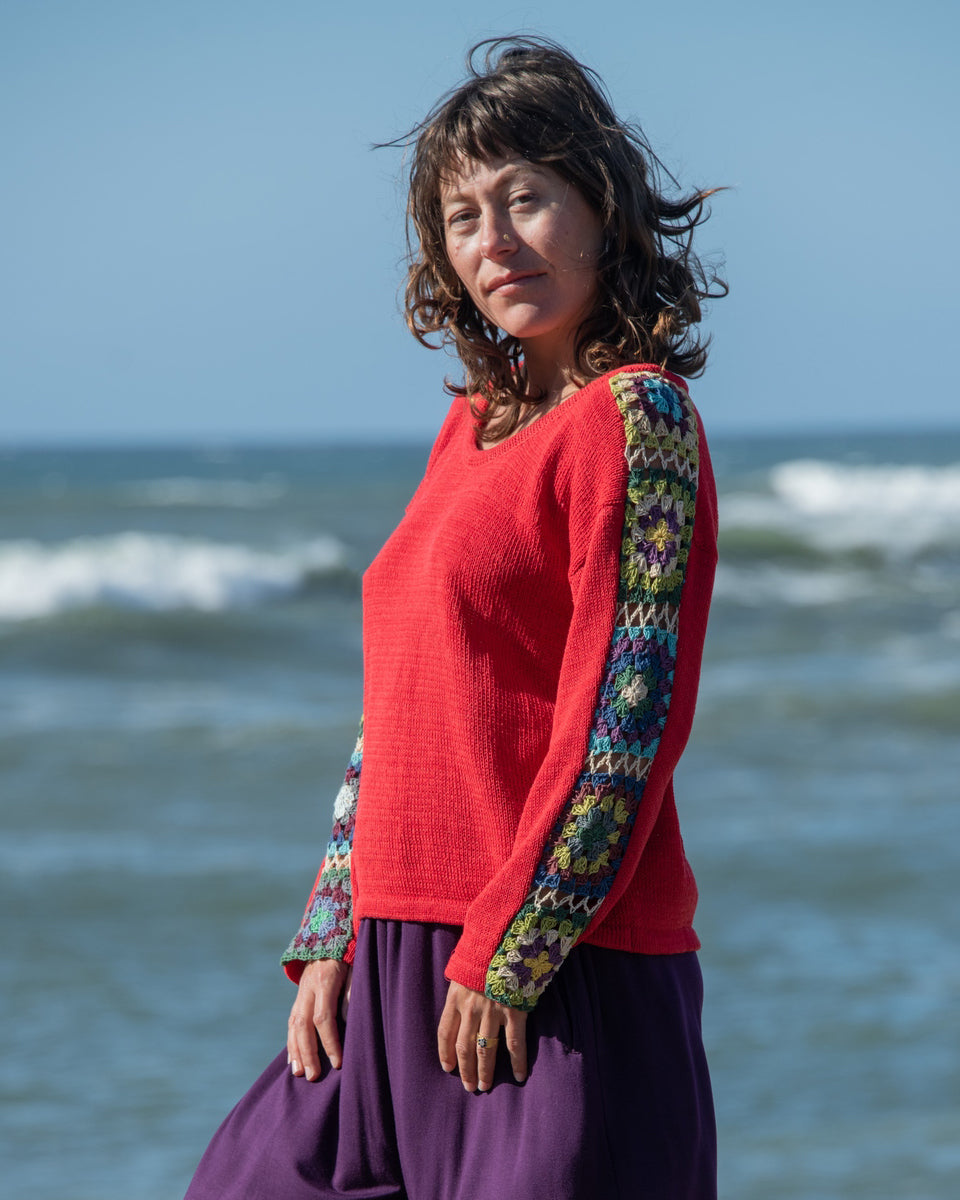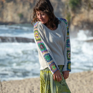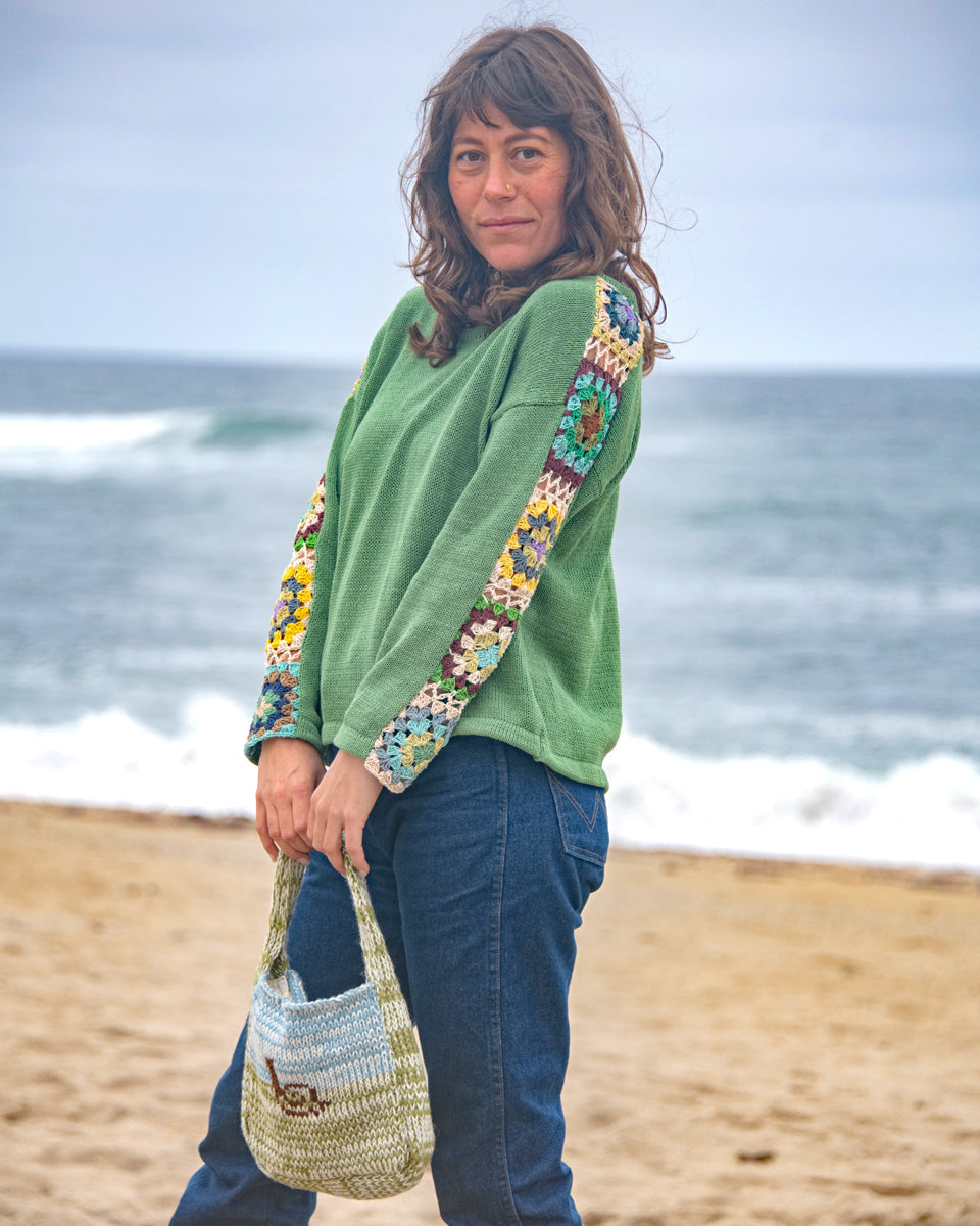 This long sleeve cotton sweater features granny squares on the sleeves