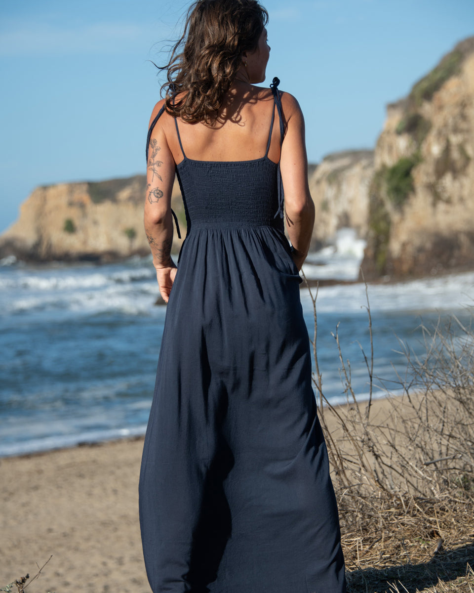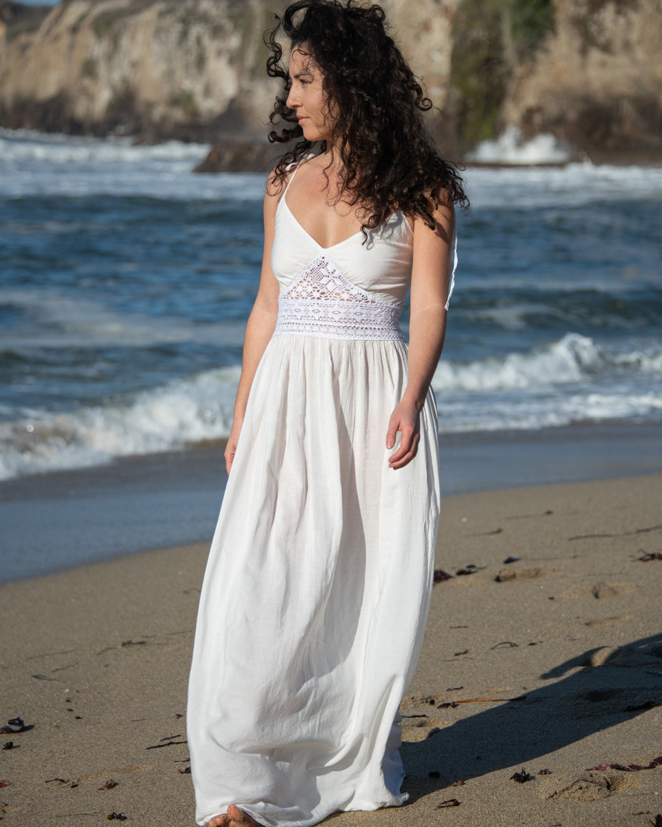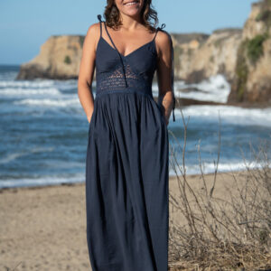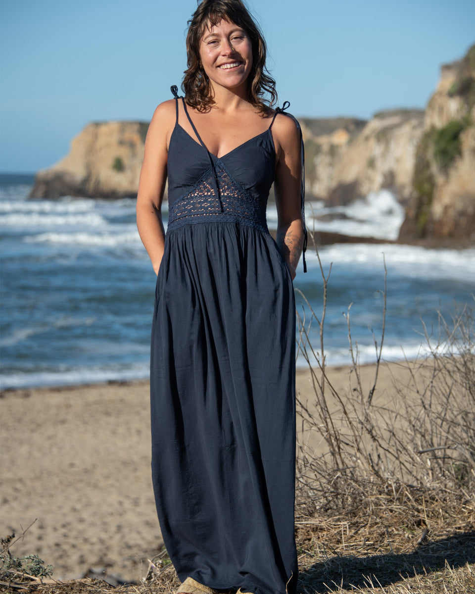 This long maxi dress features a lacy waist, shoulder ties and pockets