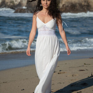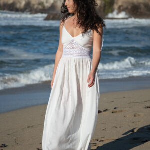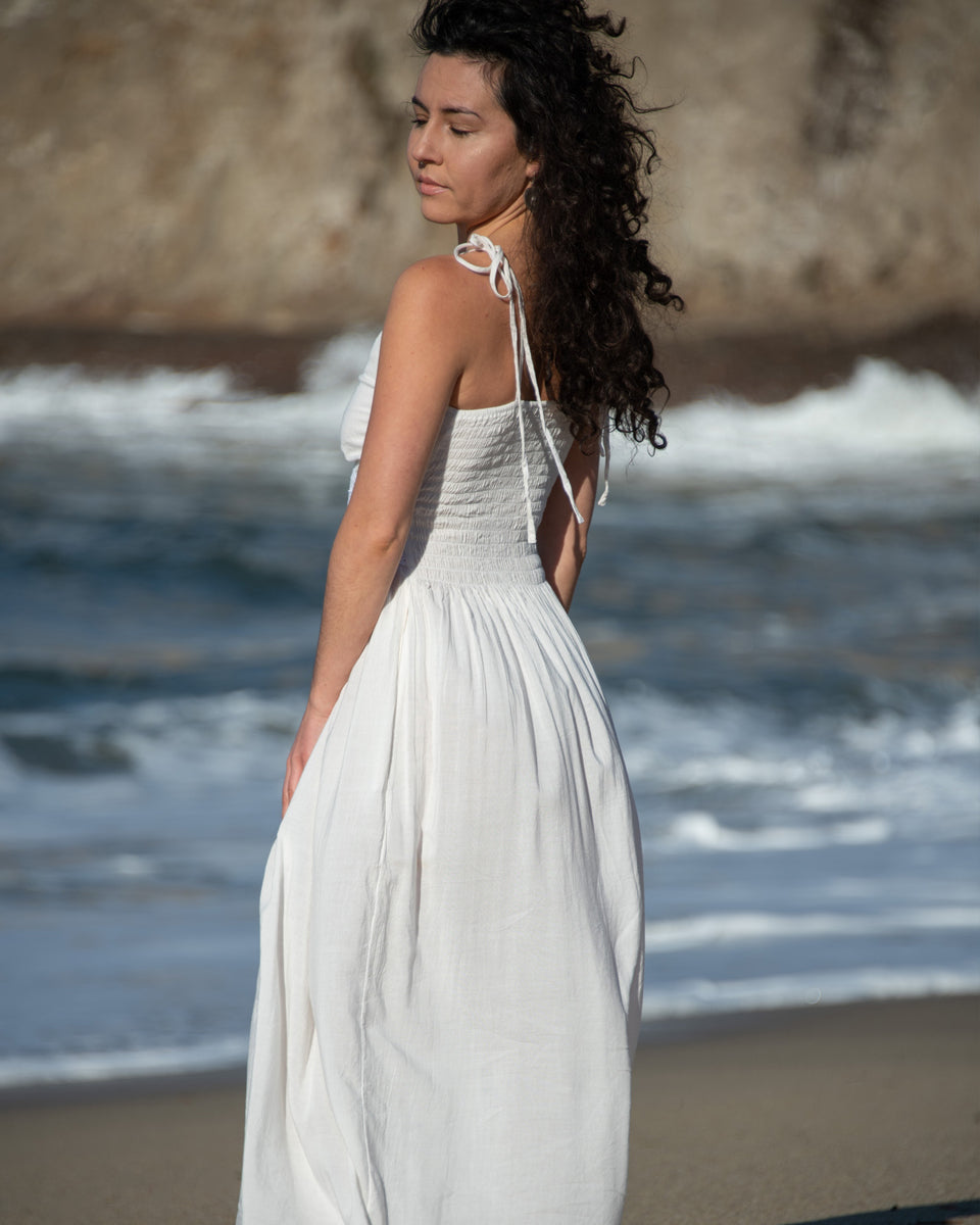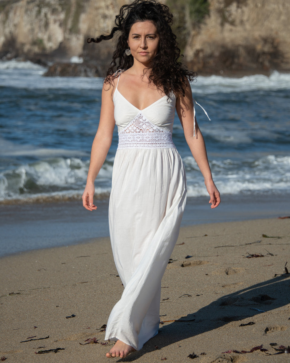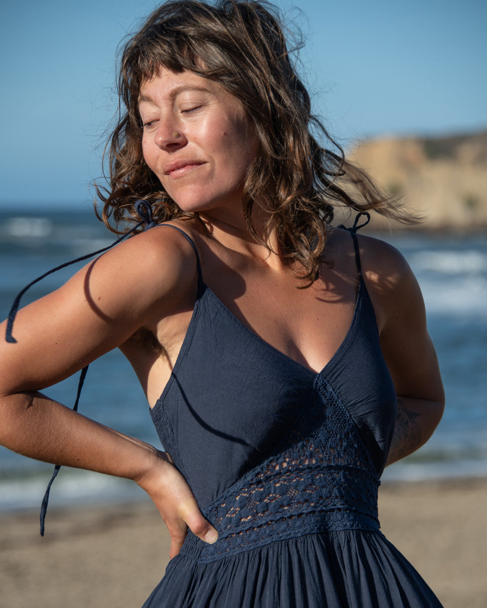 This long maxi dress features a lacy waist, shoulder ties and pockets