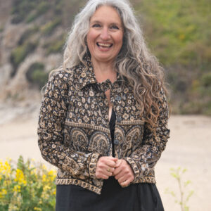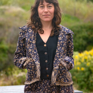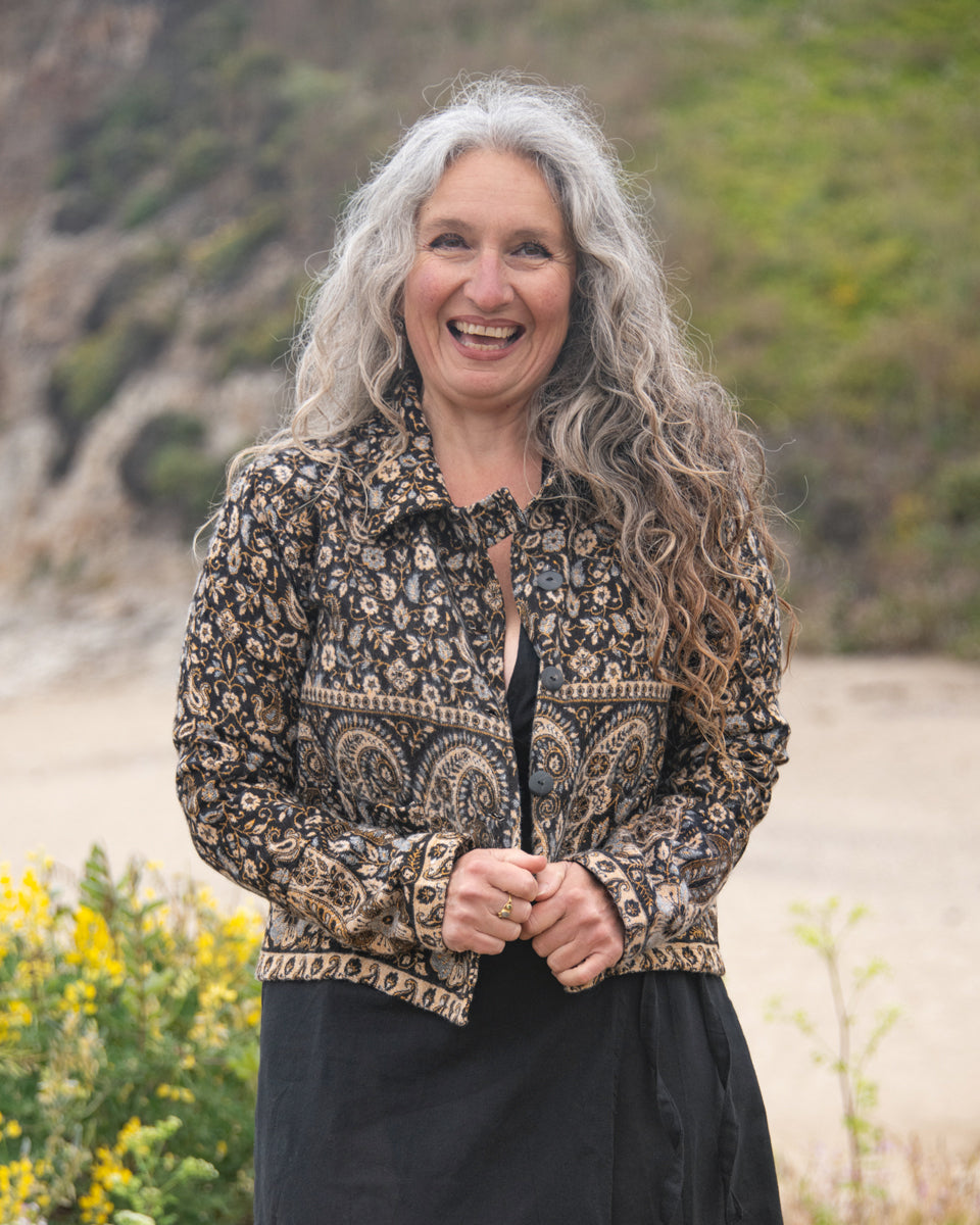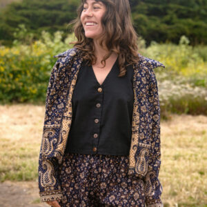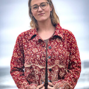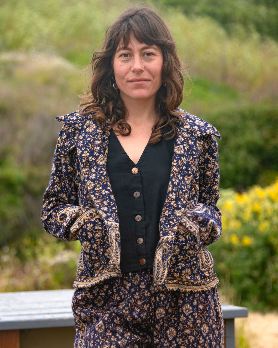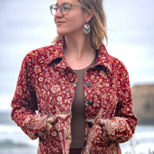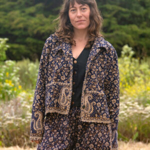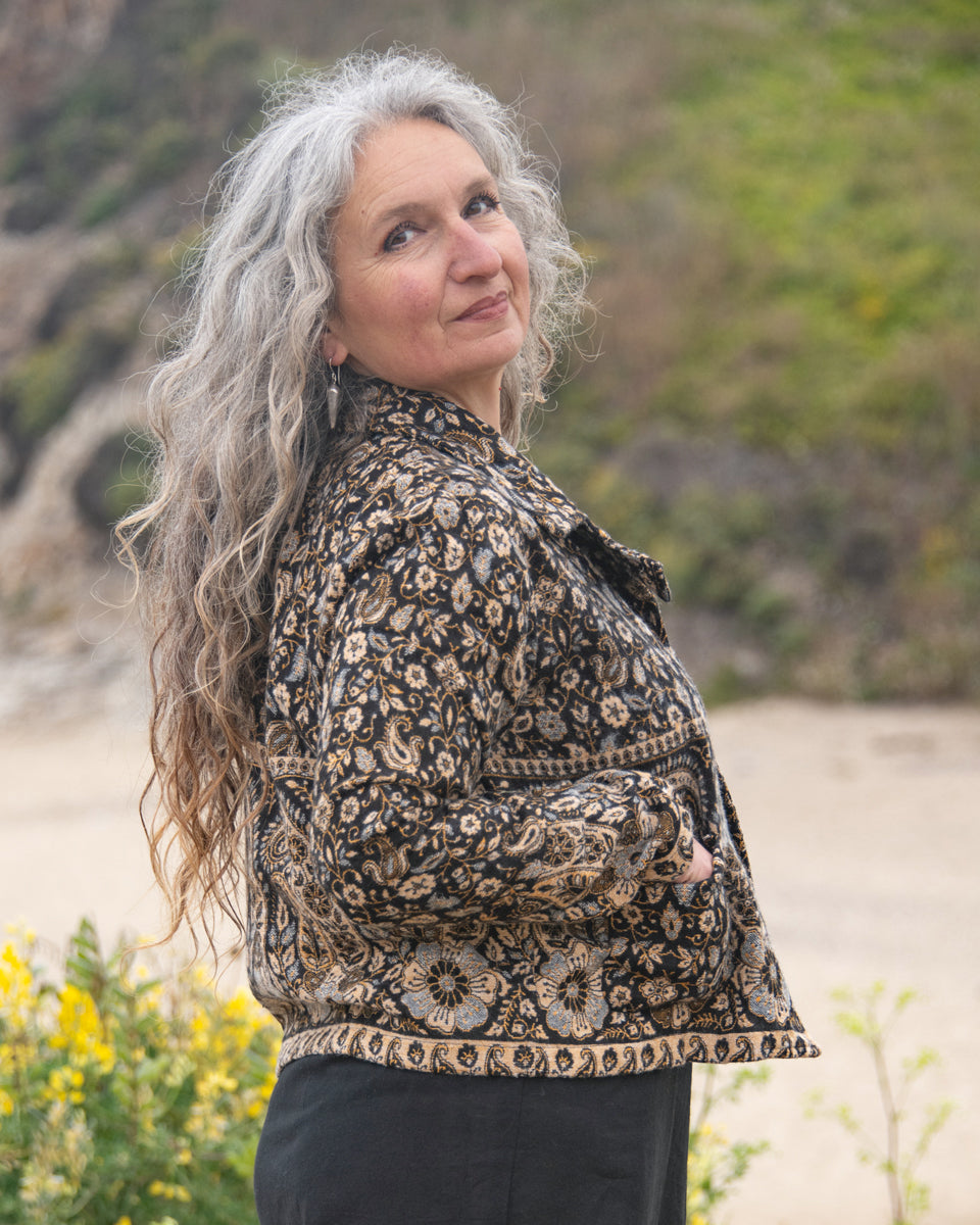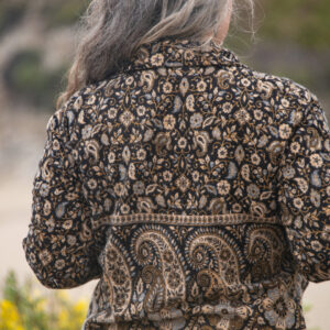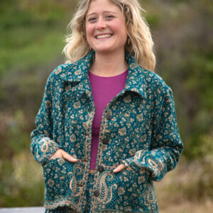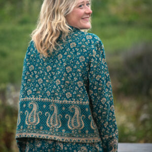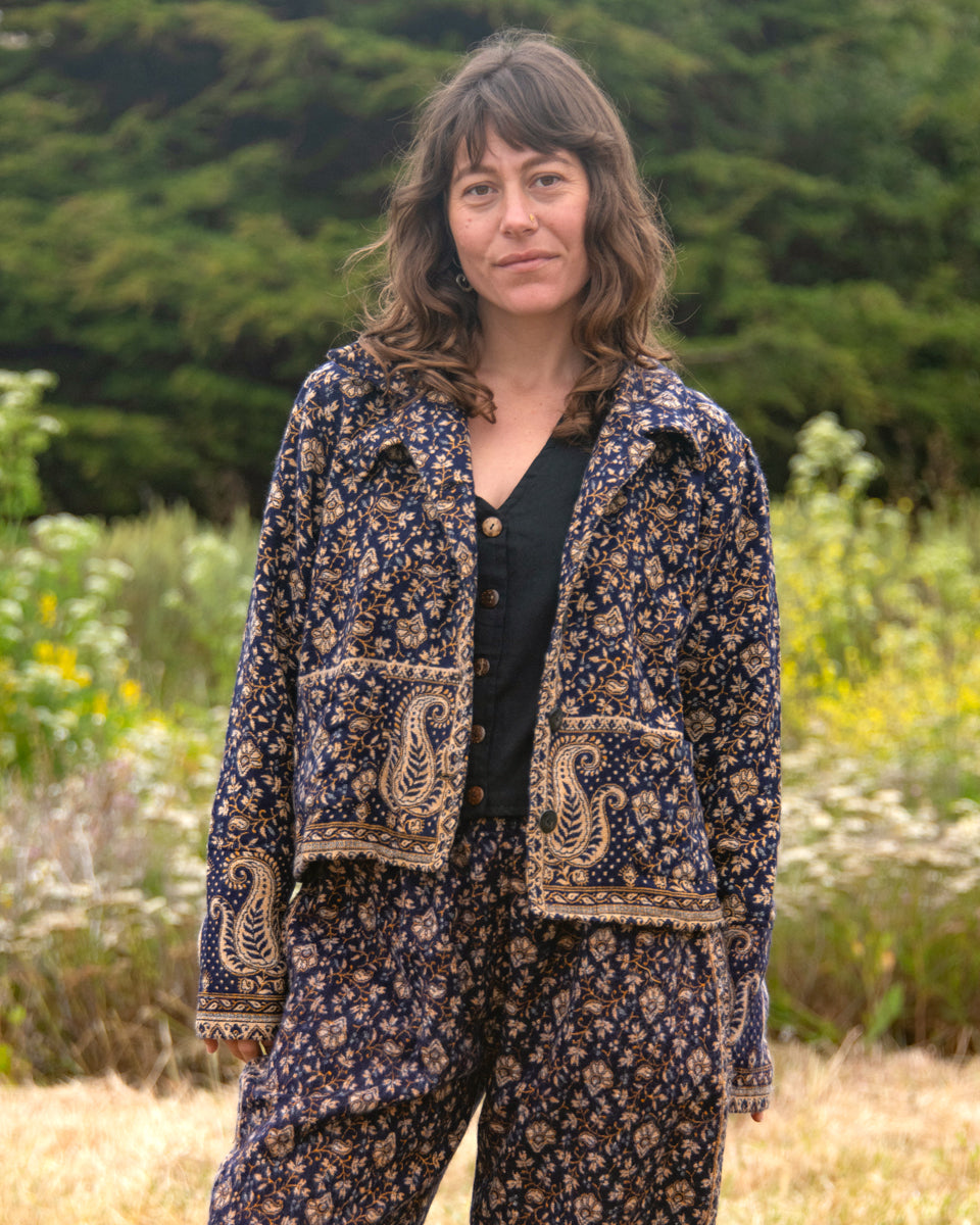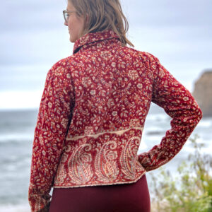 Made from soft, woven acrylic, this cropped jacket features a paisley pattern, button closure, and a classic collar.
