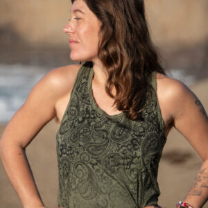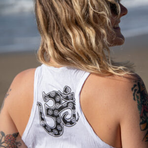 This racerback tank top is crafted from soft, breathable cotton and features a vibrant paisley screen print on the front with a serene OM symbol on the back. Its relaxed fit makes it perfect for layering or wearing on its own.