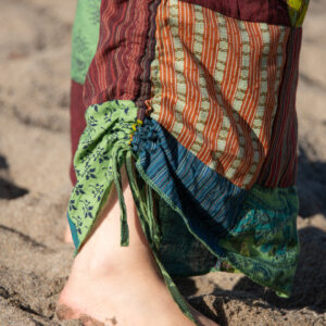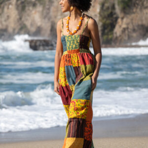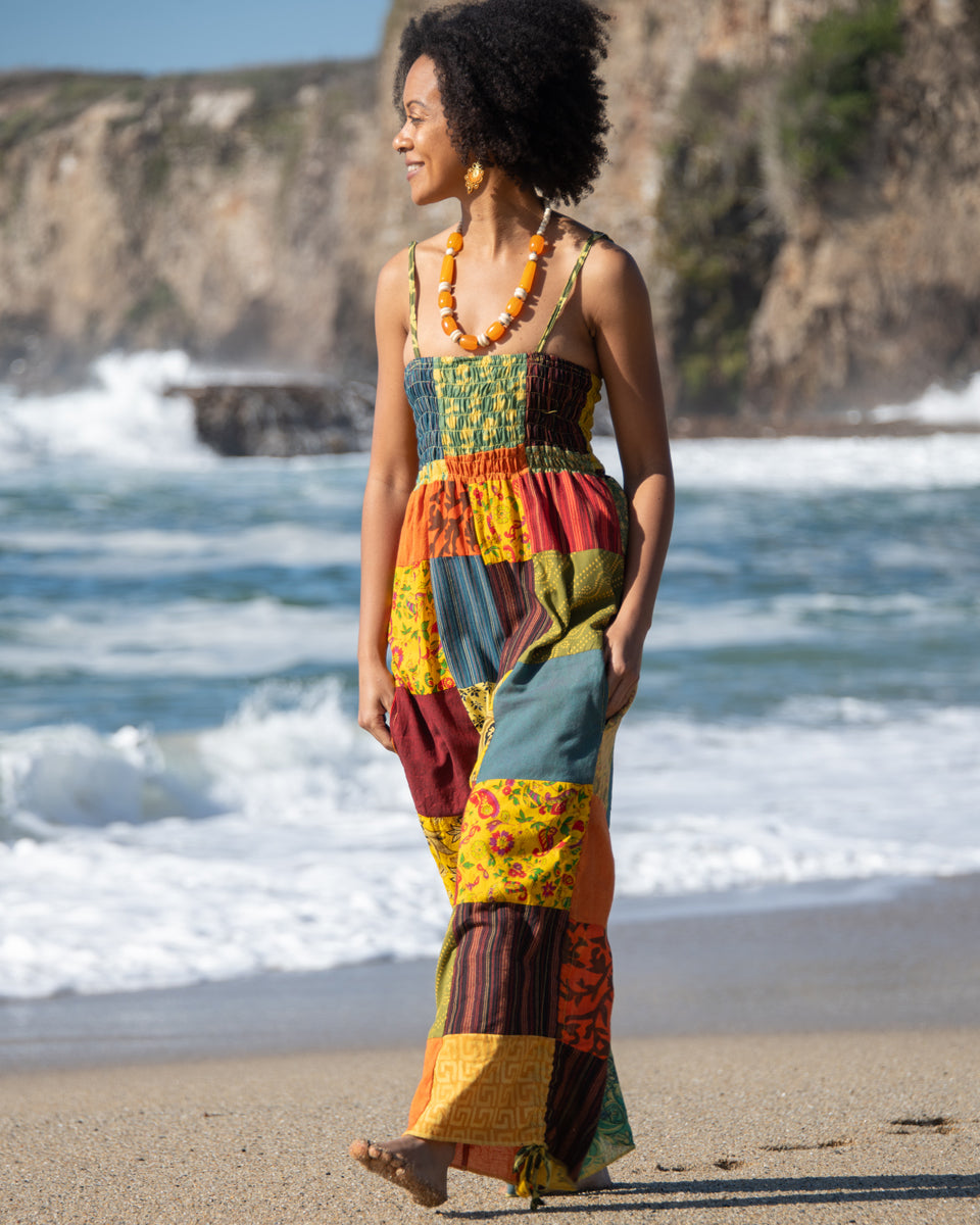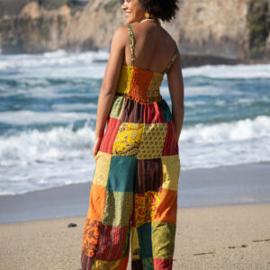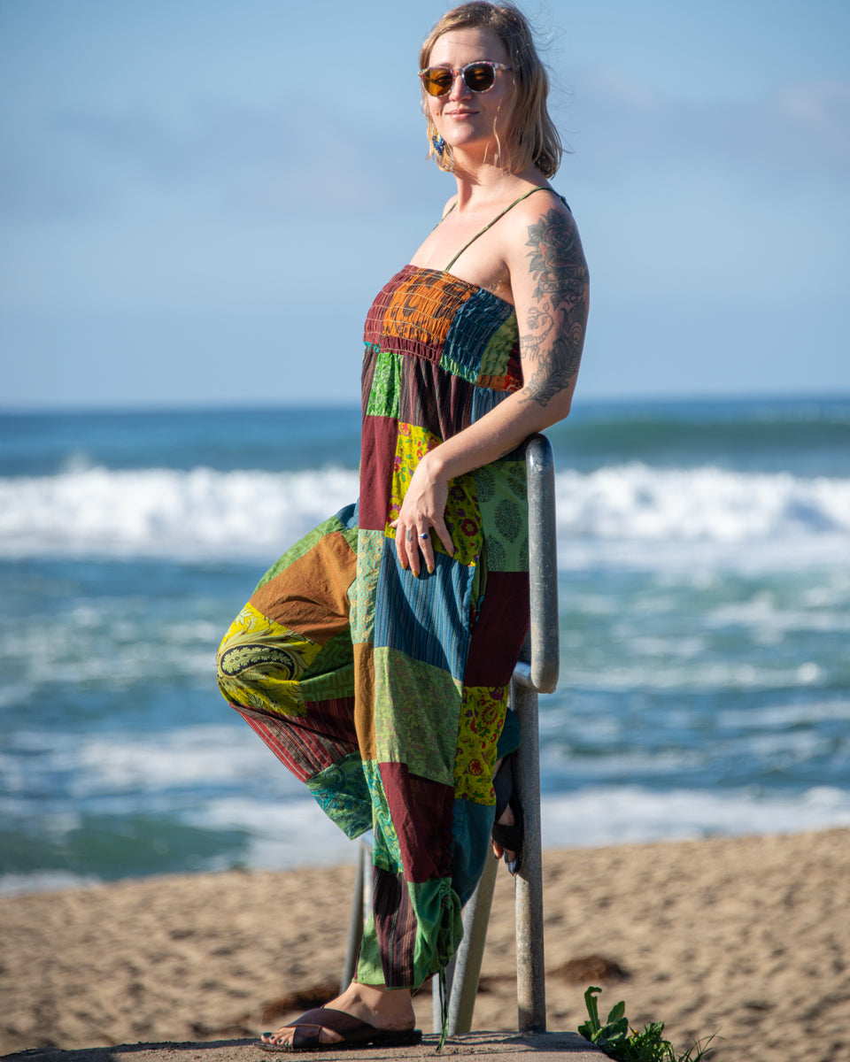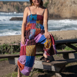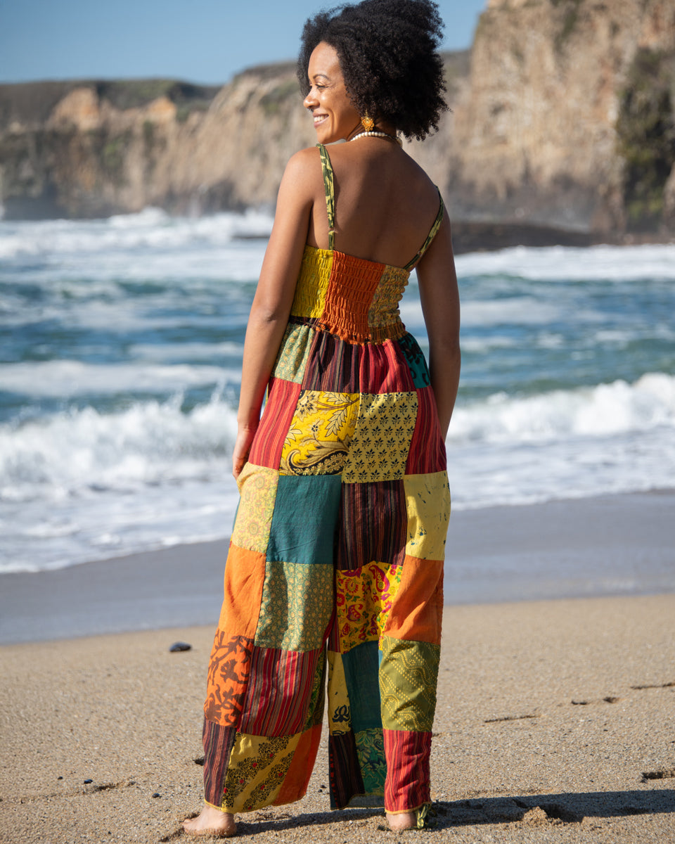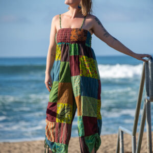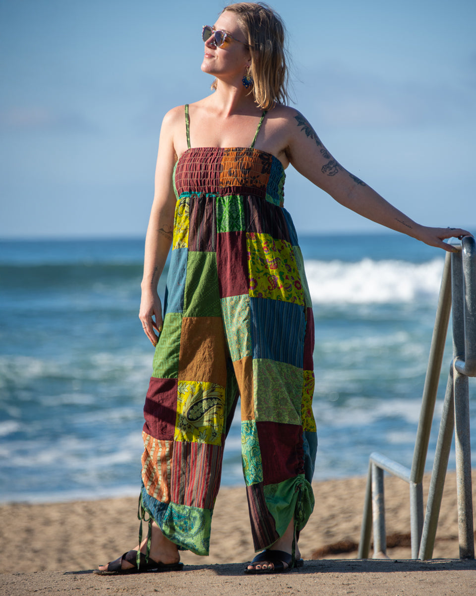 This jumpsuit feature a vibrant patchwork design, over-dyed to enhance and brighten the colors. It features a smocked top, adjustable shoulder straps, and adjustable leg ties for a customizable, comfortable fit. Perfect for casual outings or layered with your favorite accessories. Each pair is one-of-a-kind, reflecting the artisan craftsmanship of Nepal.