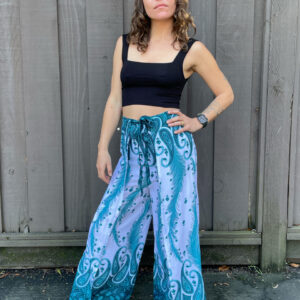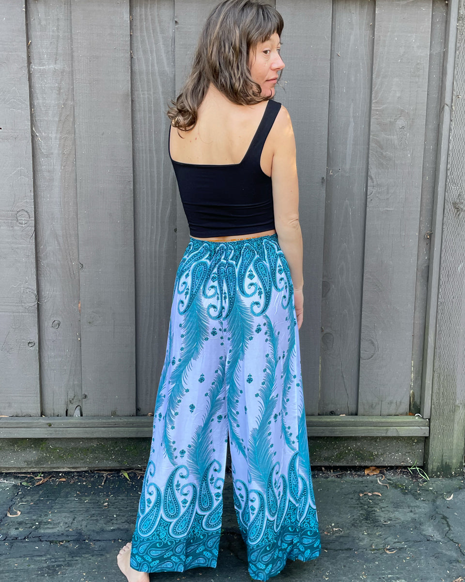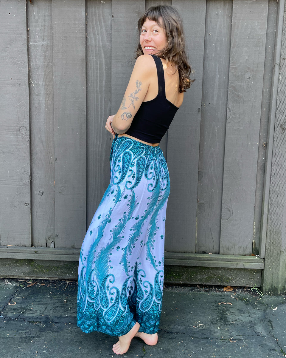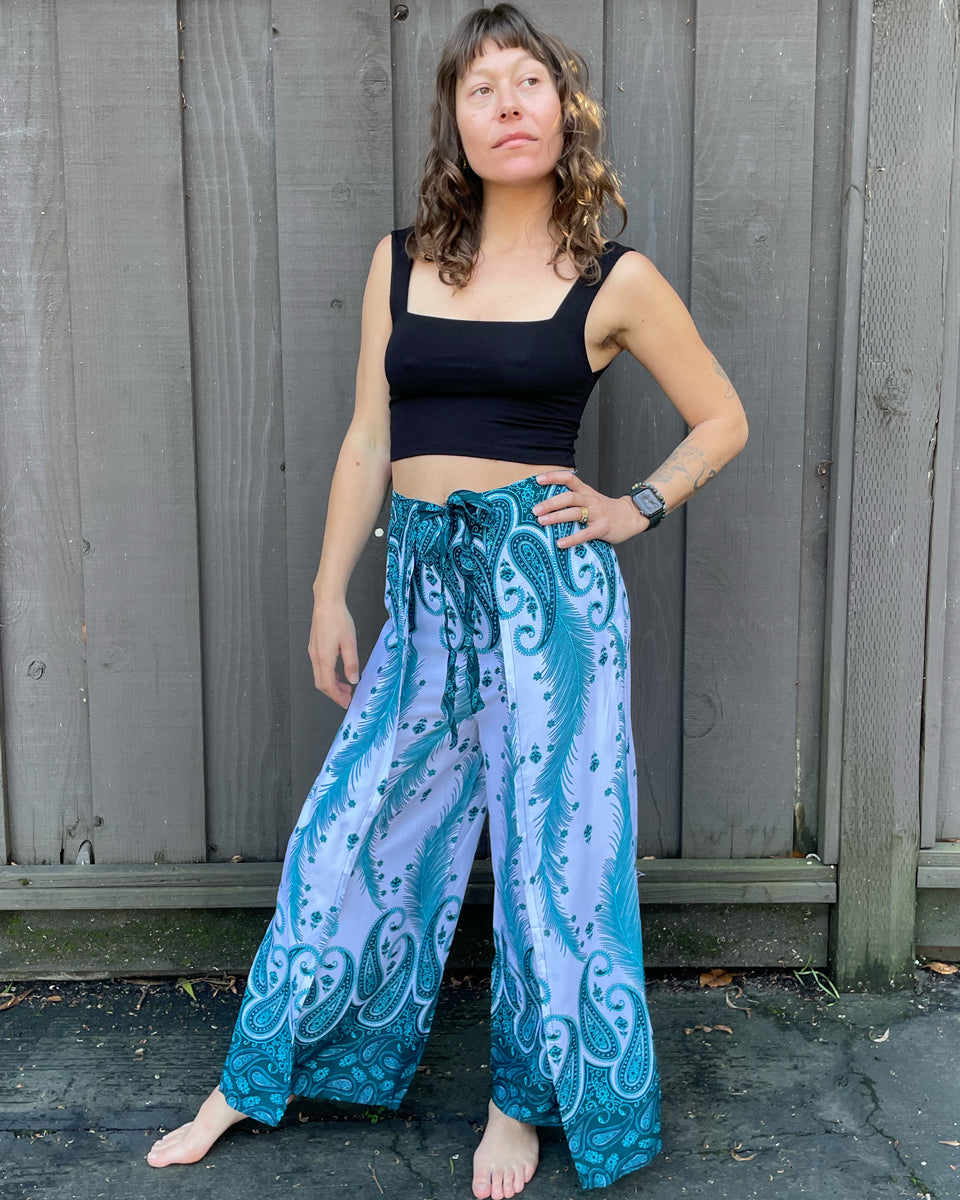 These pants feature a tribal peacock print with a white background, and have wide legs and a front tie.