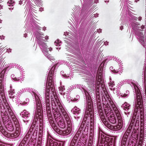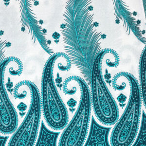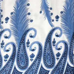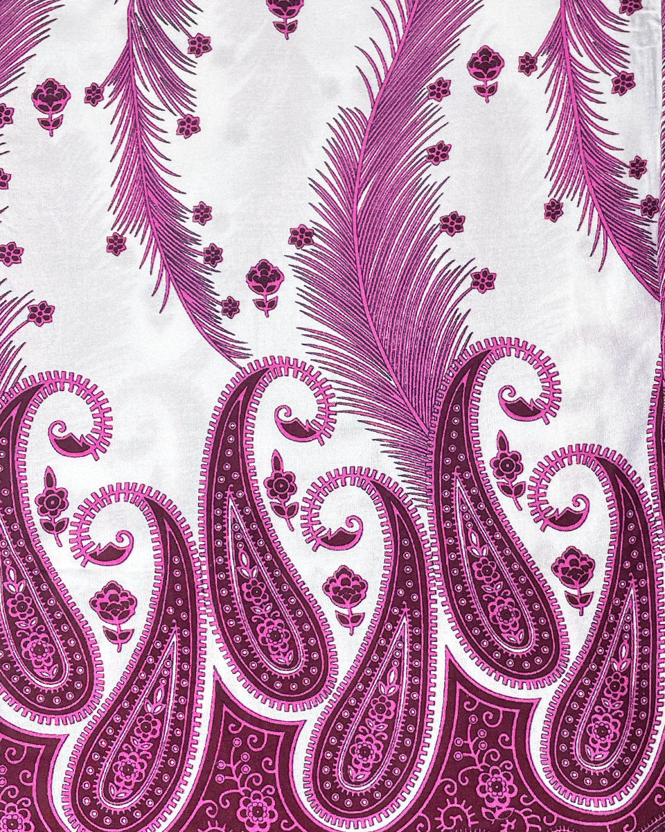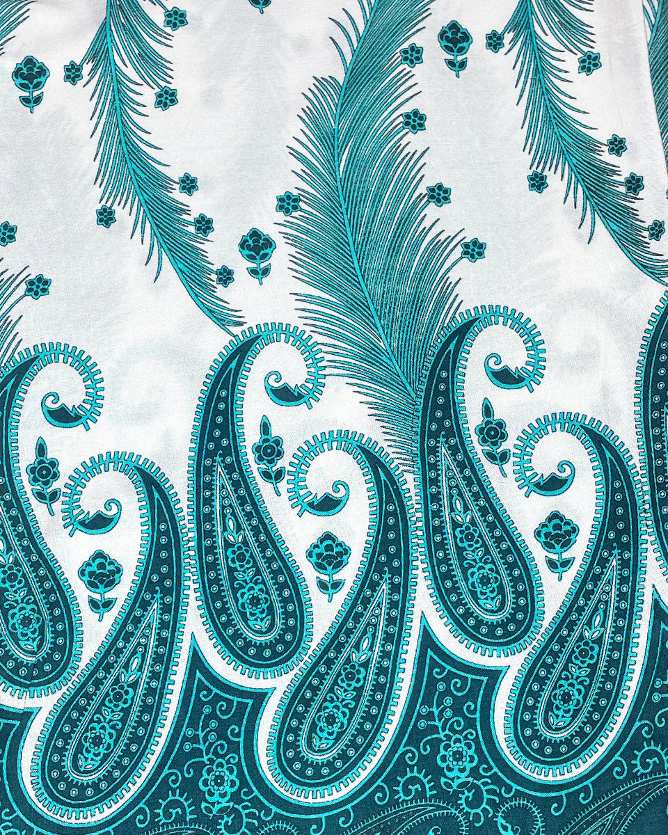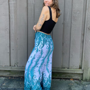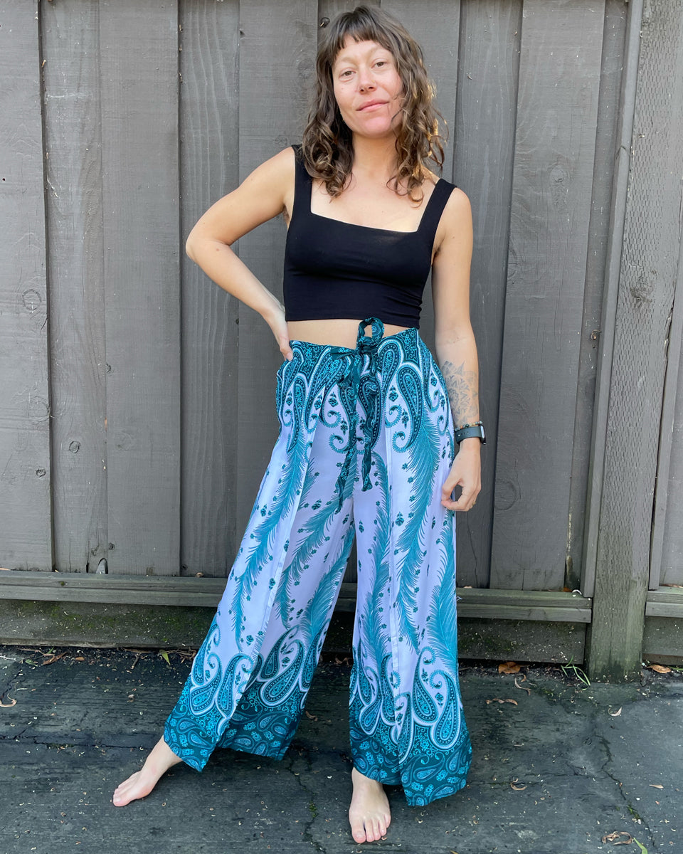 These pants feature a tribal peacock print with a white background, and have wide legs and a front tie.