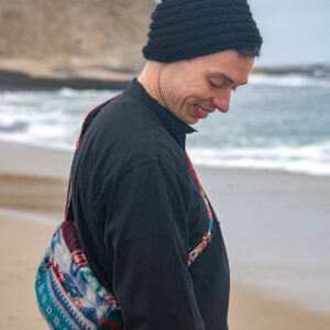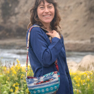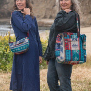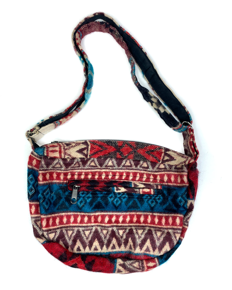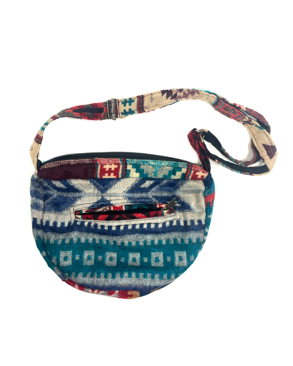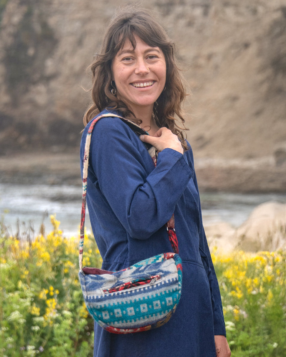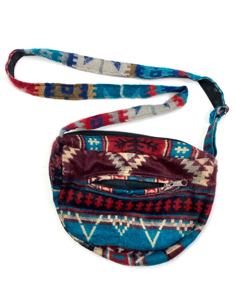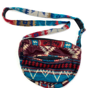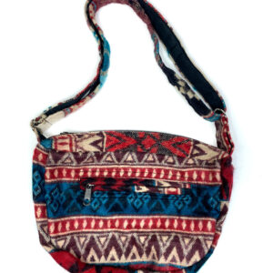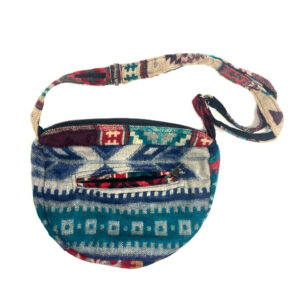 This one of a kind small sling bag is made out of traditional Indian shawls. It features adjustable straps, zipper closure and two inner pockets