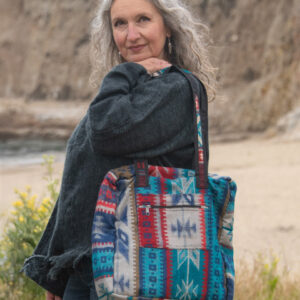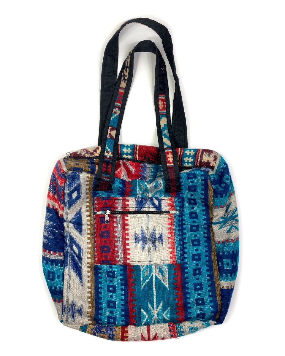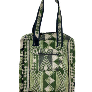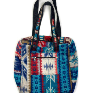 This one of a kind tote bag is made out of traditional Indian shawls. It features two handles, a zipper closure, outer pocket, and is lined with cotton. This bag is available in assorted colors.