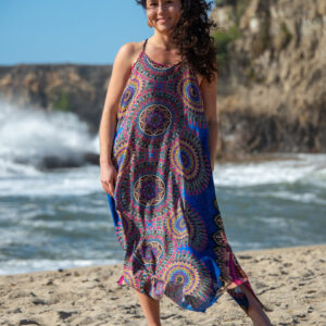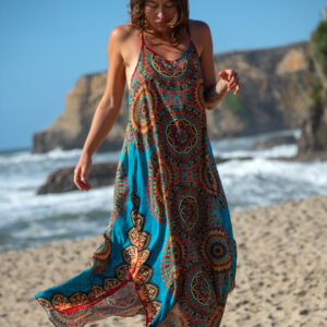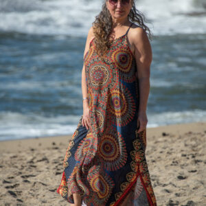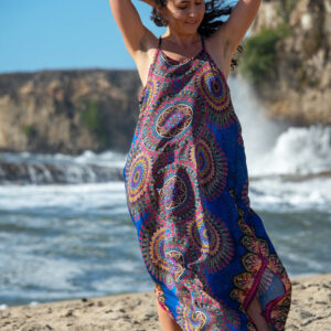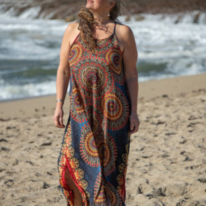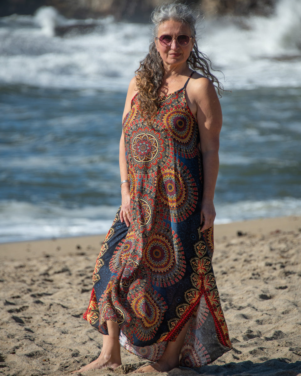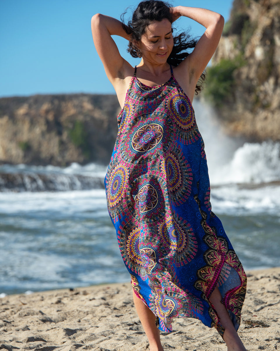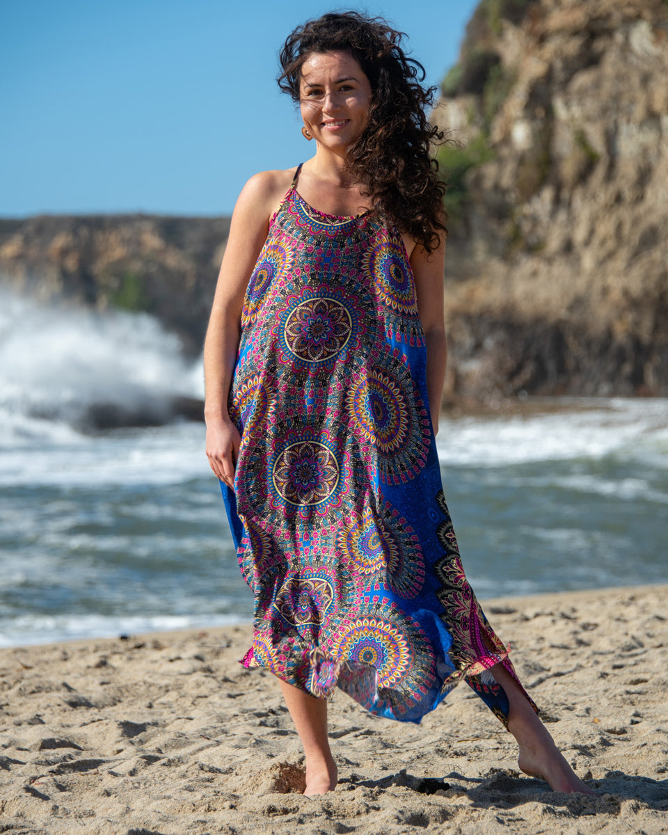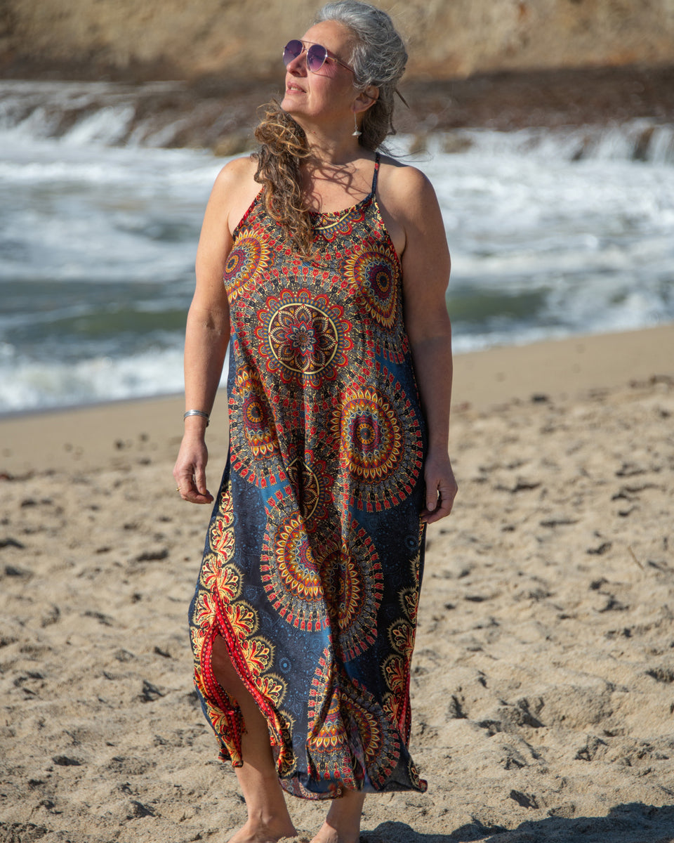 This sleeveless maxi dress features a full body shiva mandala print, side slits, and adjustable straps.