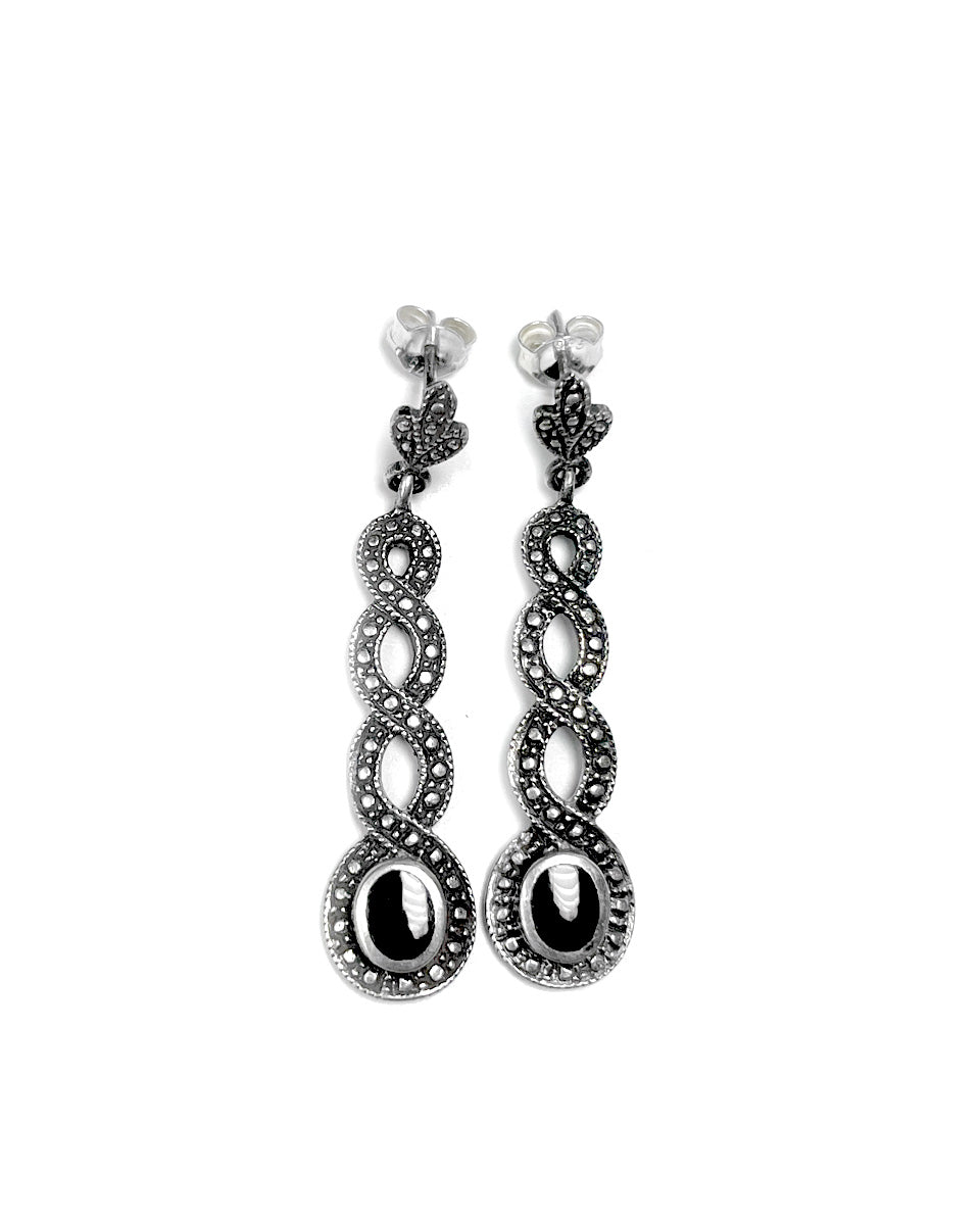 Earring with stud and braided dangle with onyx, sterling silver, Thailand