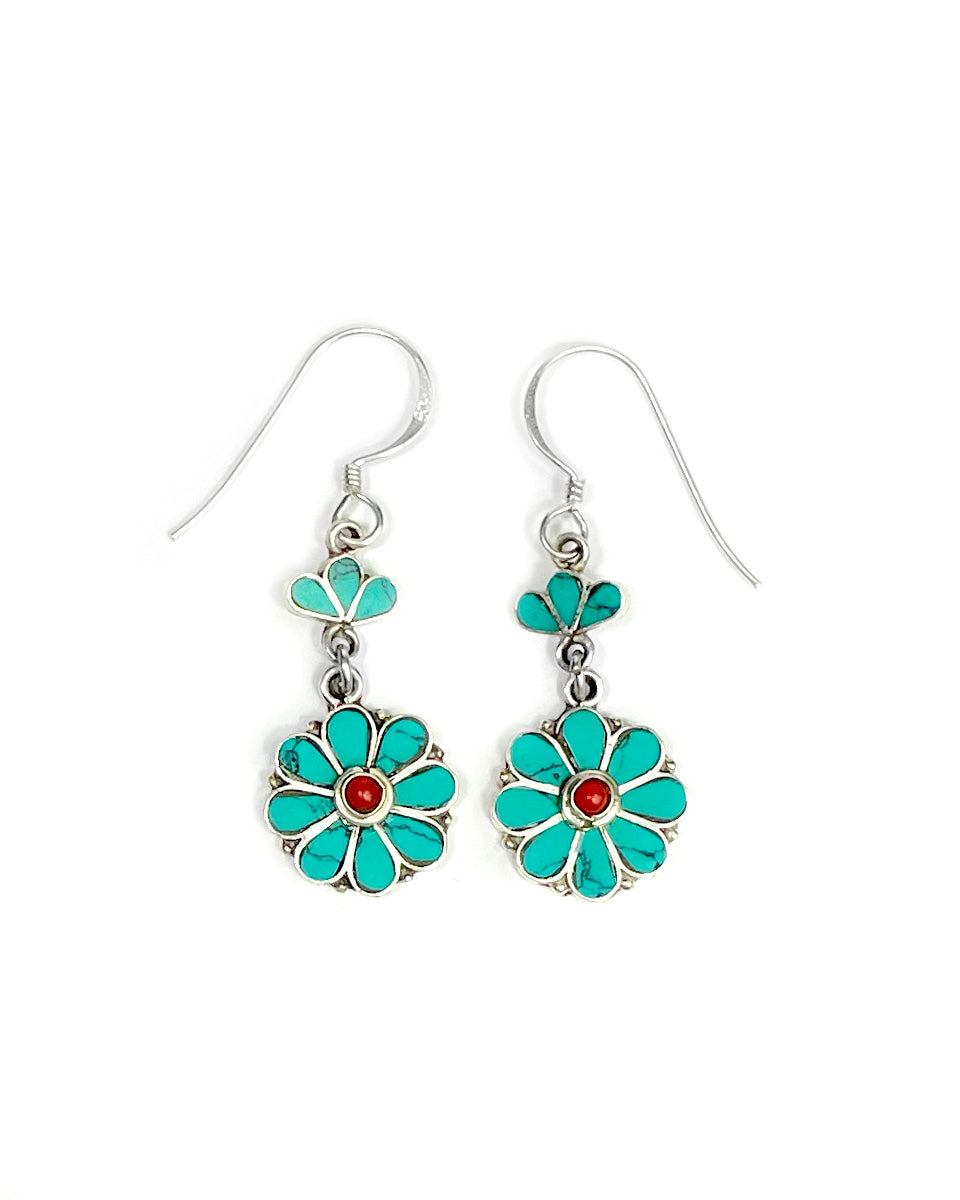 These hanging earrings feature a Tibetan style flower, color: turquoise/ coral, lapiz/coral,