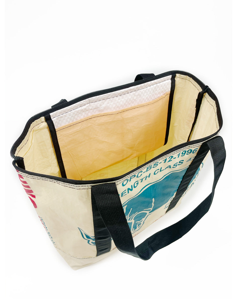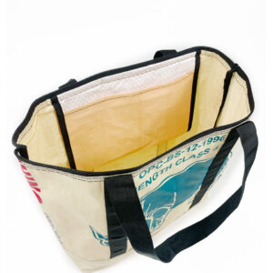 These tote bags are made from upcycled cement bags, and feature an inside pouch, zipper closure and two handles