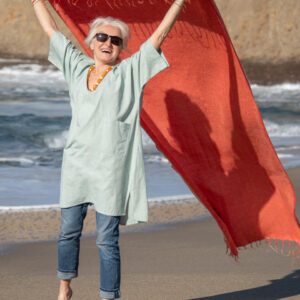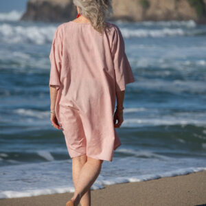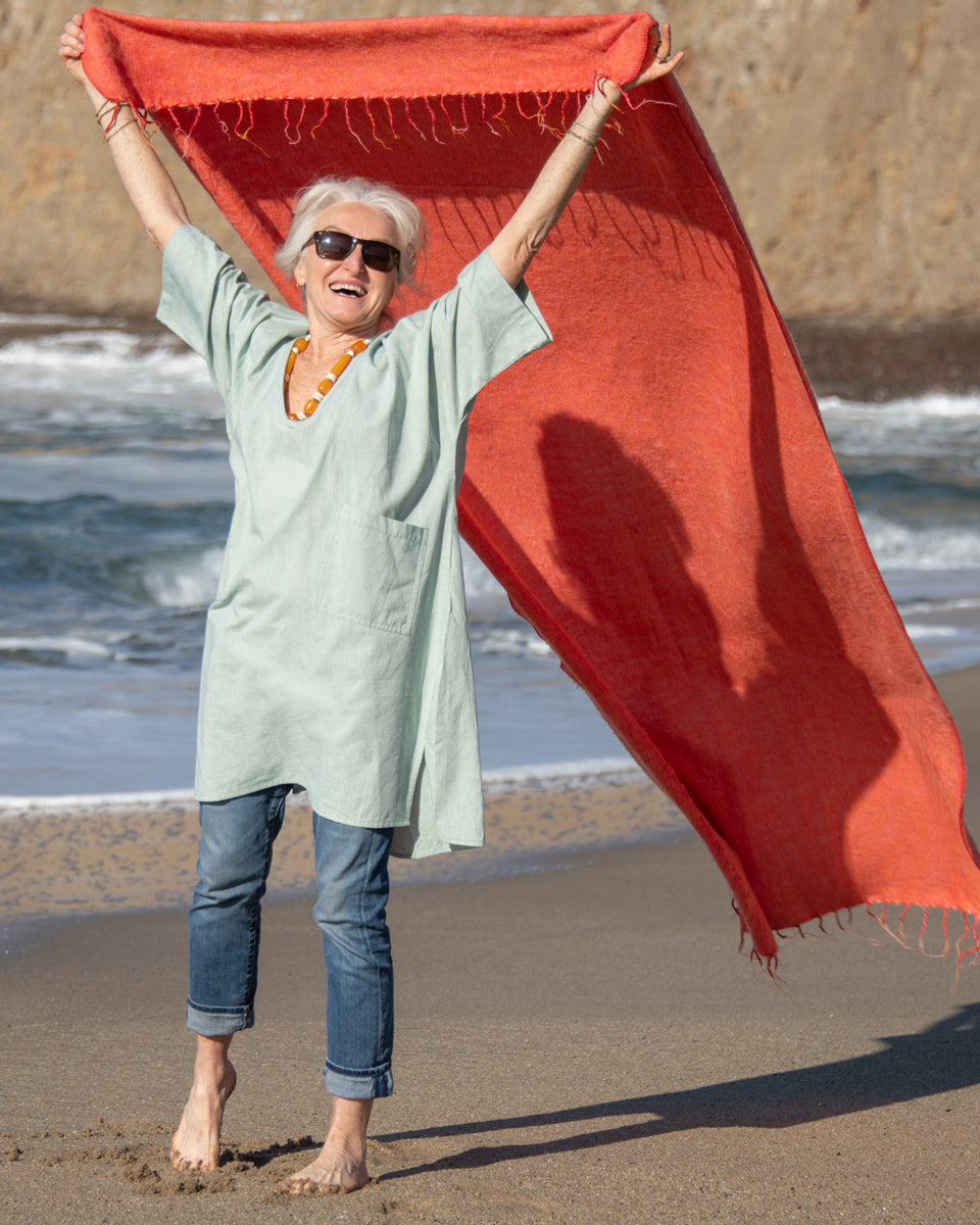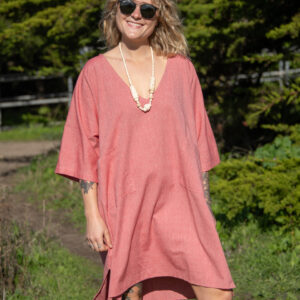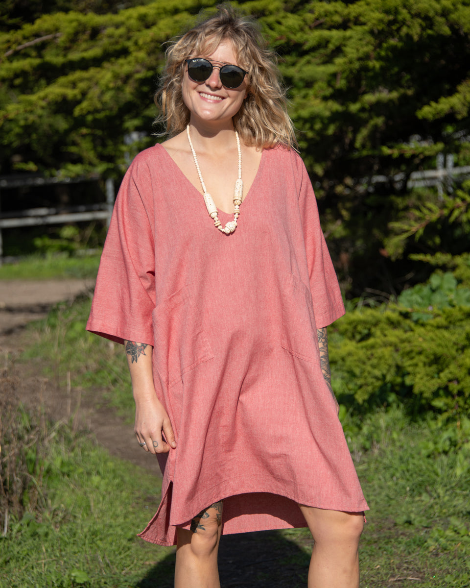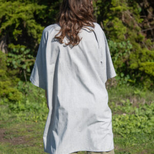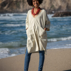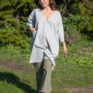 This timeless boxy cotton tunic has returned, now in a soft palette of pastels. It has a V-neck, front pockets, and short sleeves.