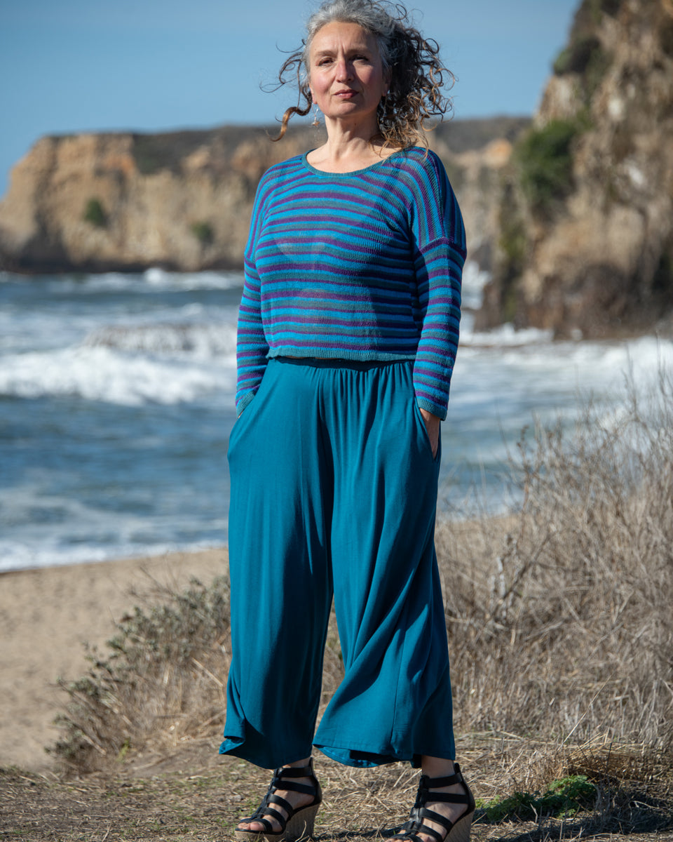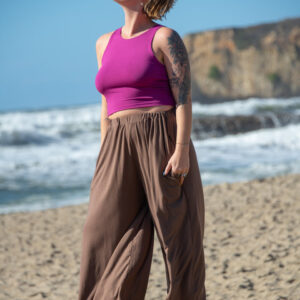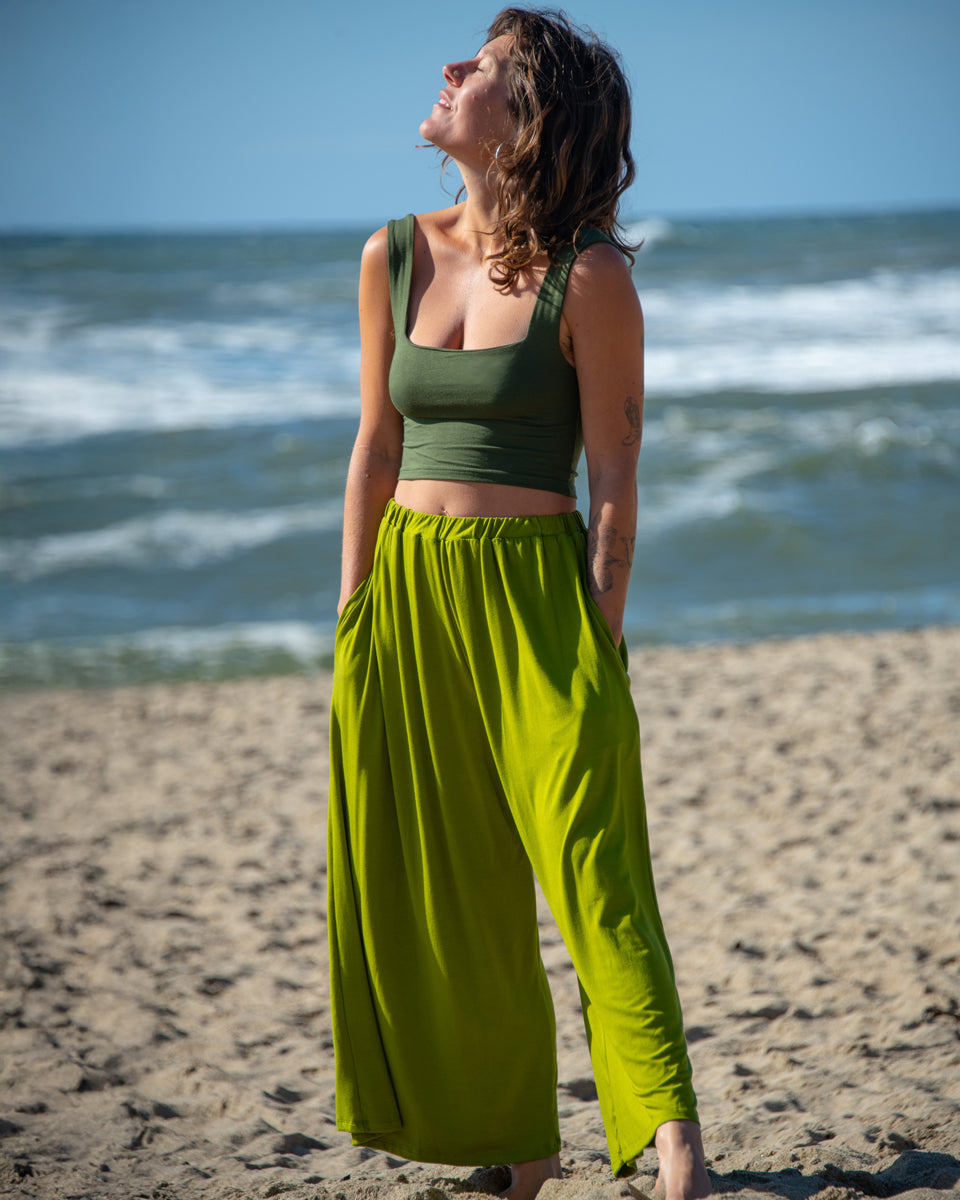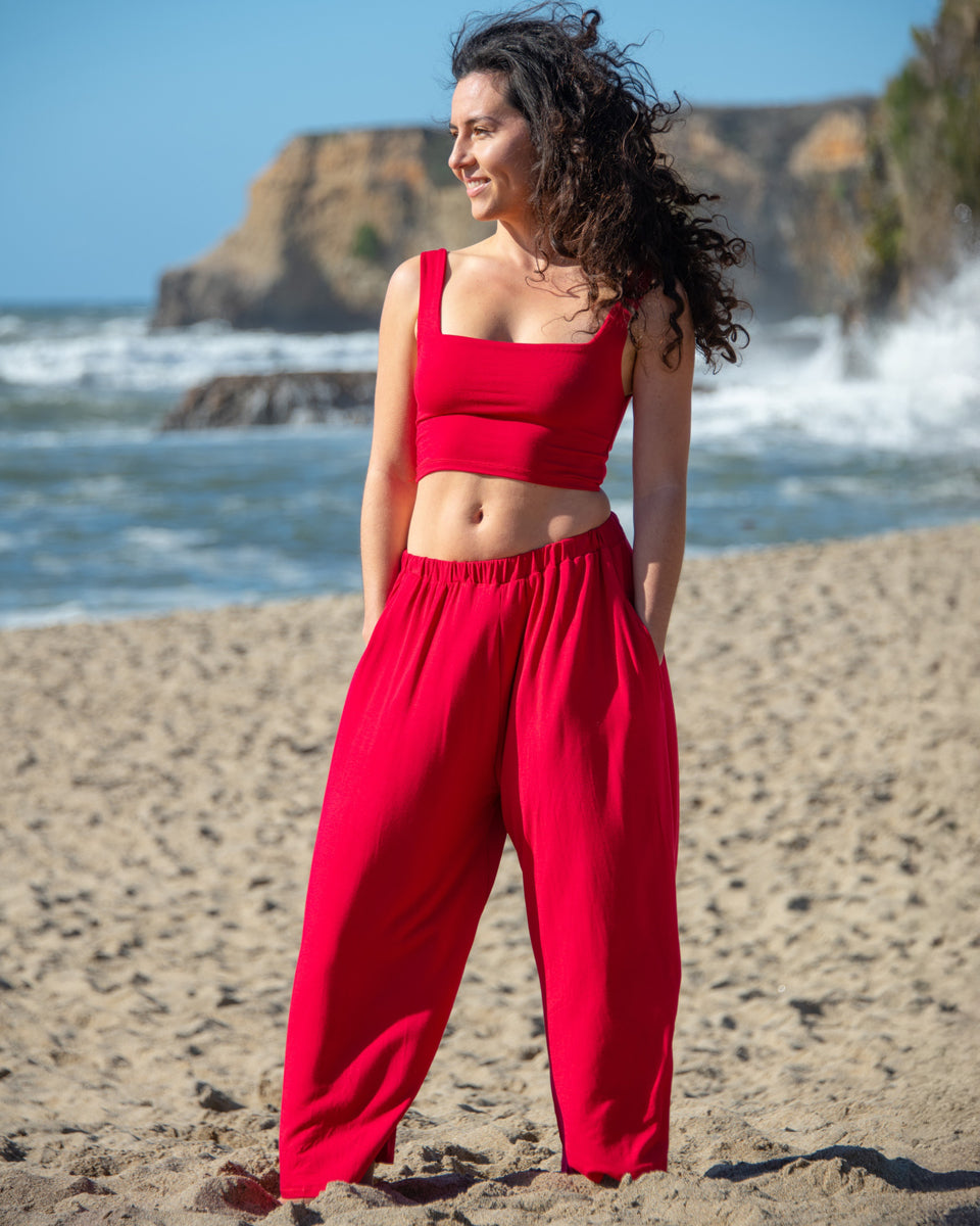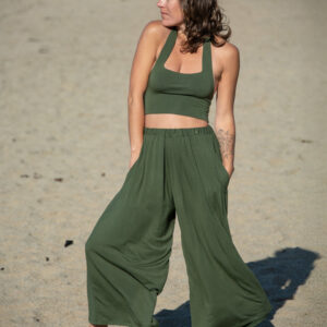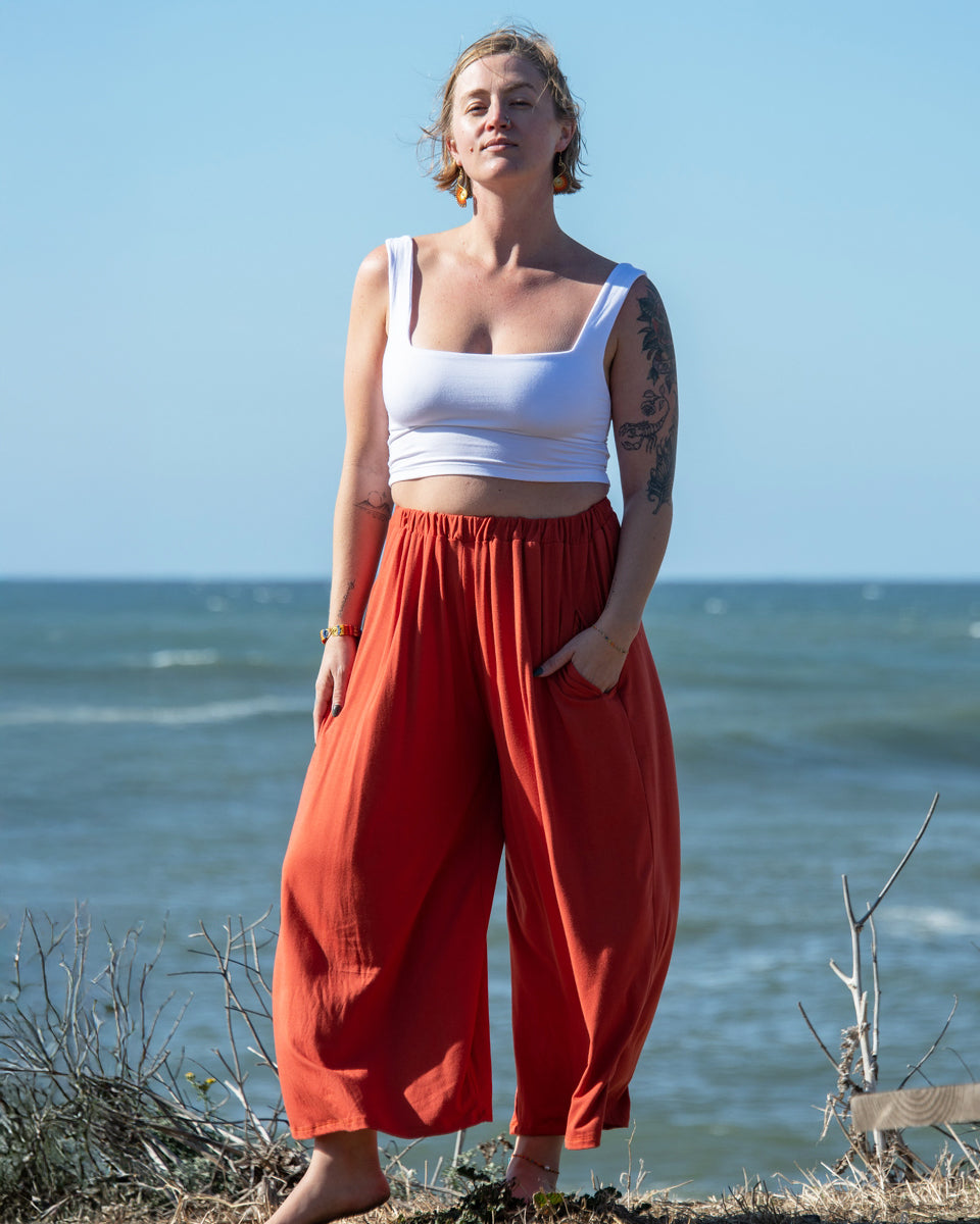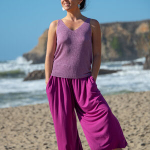 These simple pants feature a wide leg gaucho style, with side pockets and elastic waist