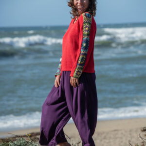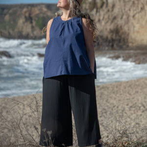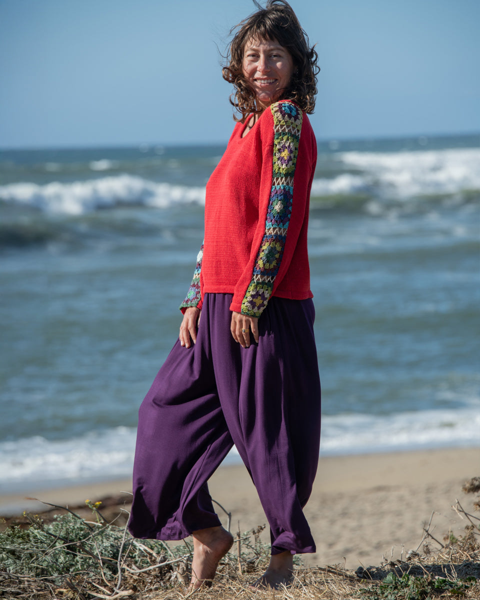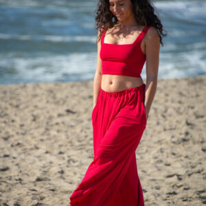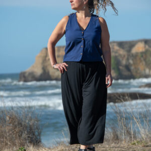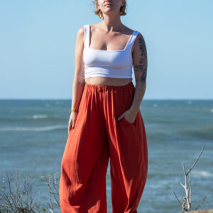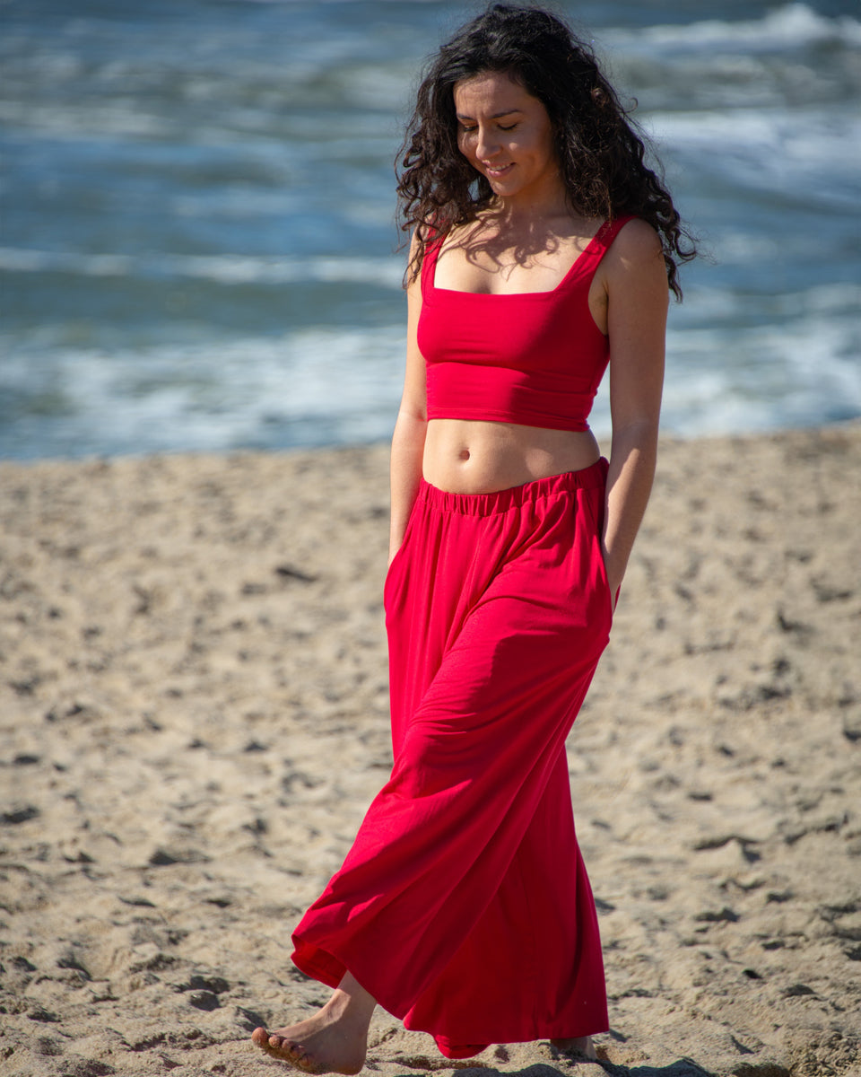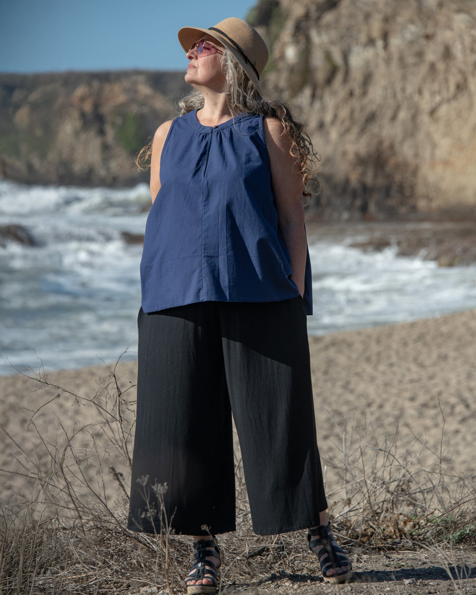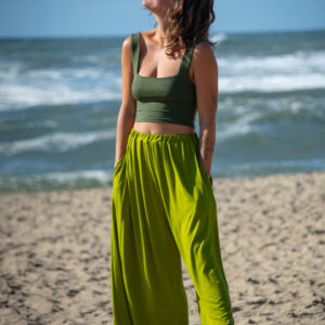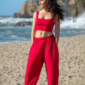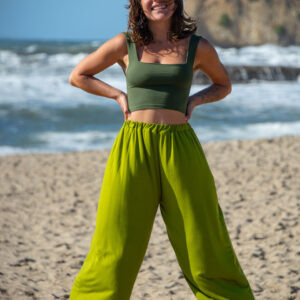 These simple pants feature a wide leg gaucho style, with side pockets and elastic waist