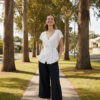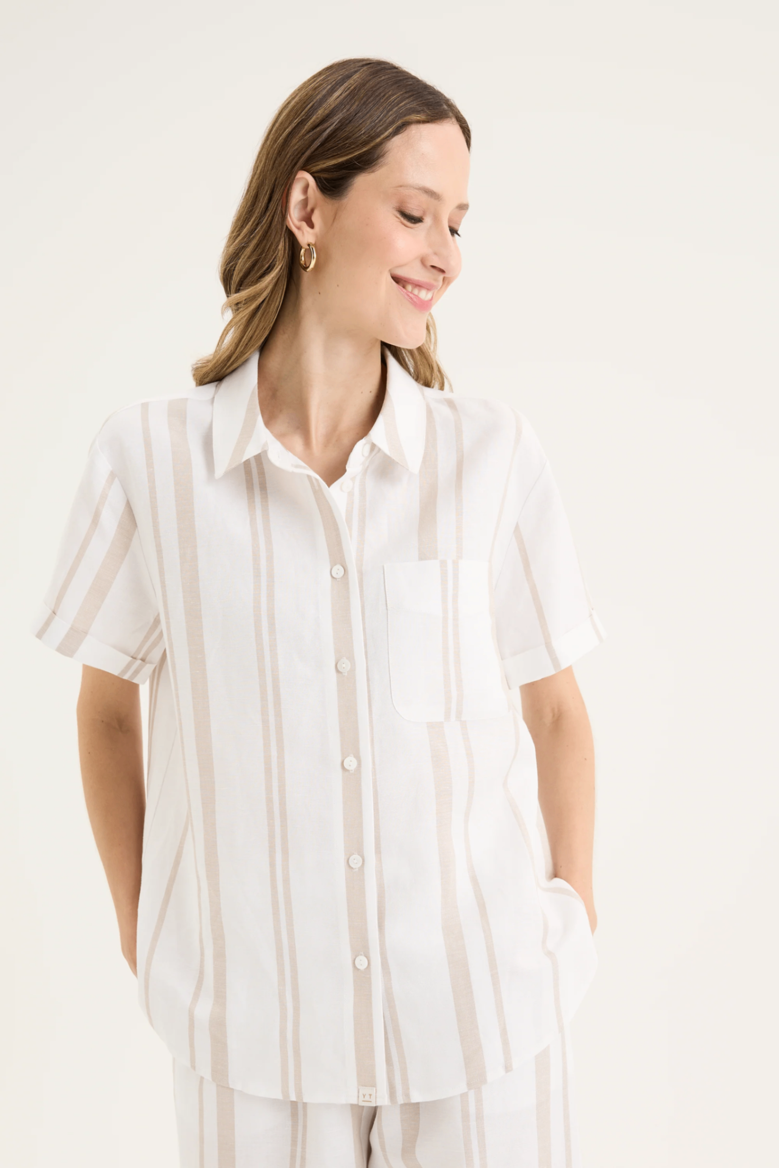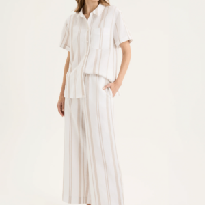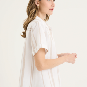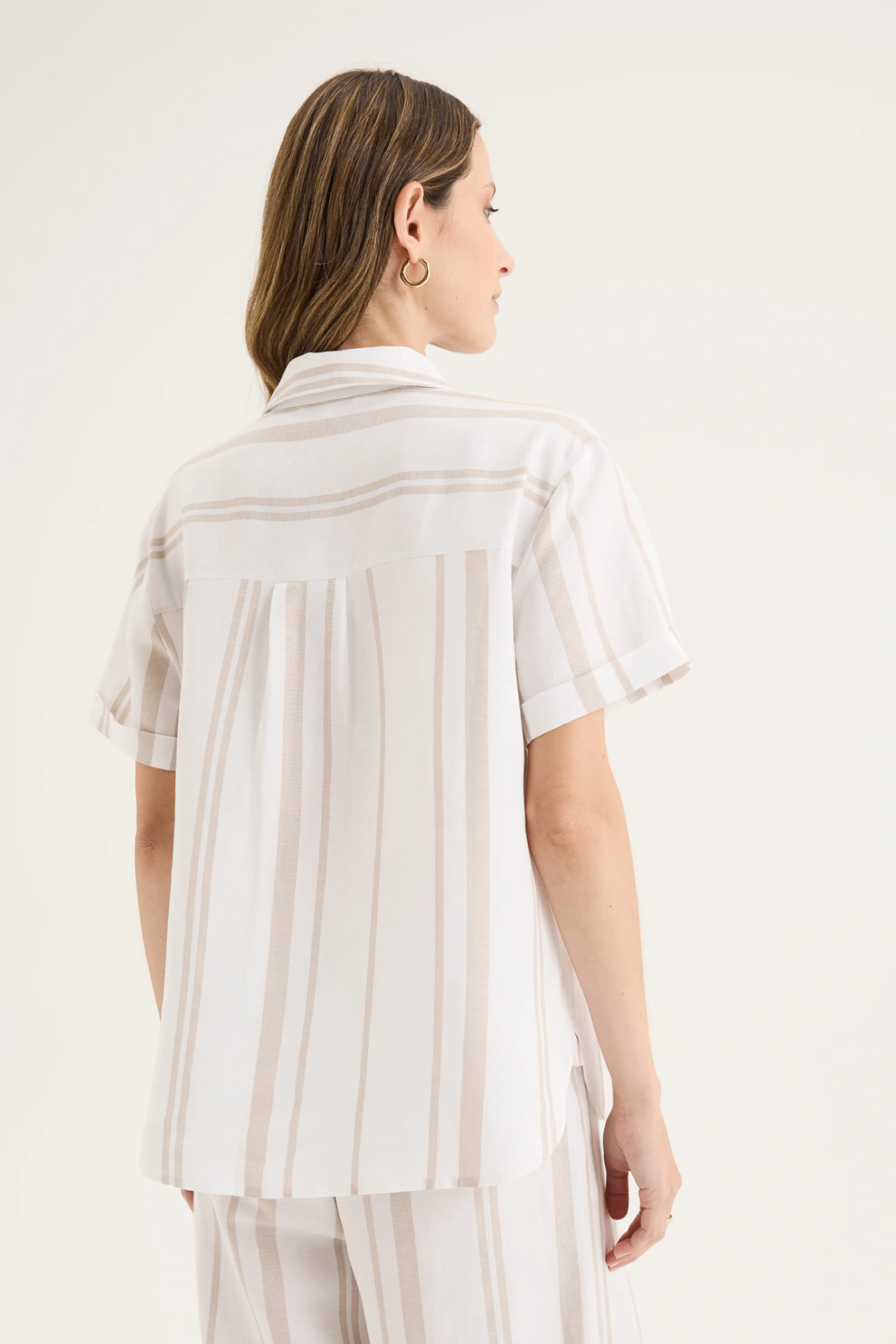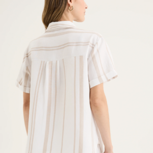 The Yarra Trail Byron Shirt in White/ Twine brings an effortless polish to summer dressing. Made from a breathable linen blend, this short sleeve shirt features a classic collar, button-through front, and a single chest pocket for a touch of structure. The yarn-dyed vertical stripes in soft cream and white create a clean, elongating look, while the turned-up cuffs add an easy, relaxed finish. Designed with a back yoke and gently curved hem, it drapes beautifully whether worn loose or tucked in. Pair it with the matching Byron Pant for a coordinated look that feels timeless and fresh.