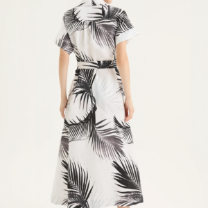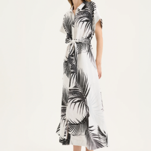 The Yarra Trail Frond Dress offers a fresh take on the classic shirt dress, blending relaxed resort style with modern sophistication. Made from a breathable linen-viscose blend, it features an exclusive leafy frond print that adds a touch of effortless vibrancy. The two-way collar can be styled open for a laid-back feel or turned up for a sharper edge, while the button-through front with topstitch detailing lends a refined finish. Wide-cuffed short sleeves and a softly gathered back yoke create a flattering, easy-to-wear silhouette perfect for warm days.